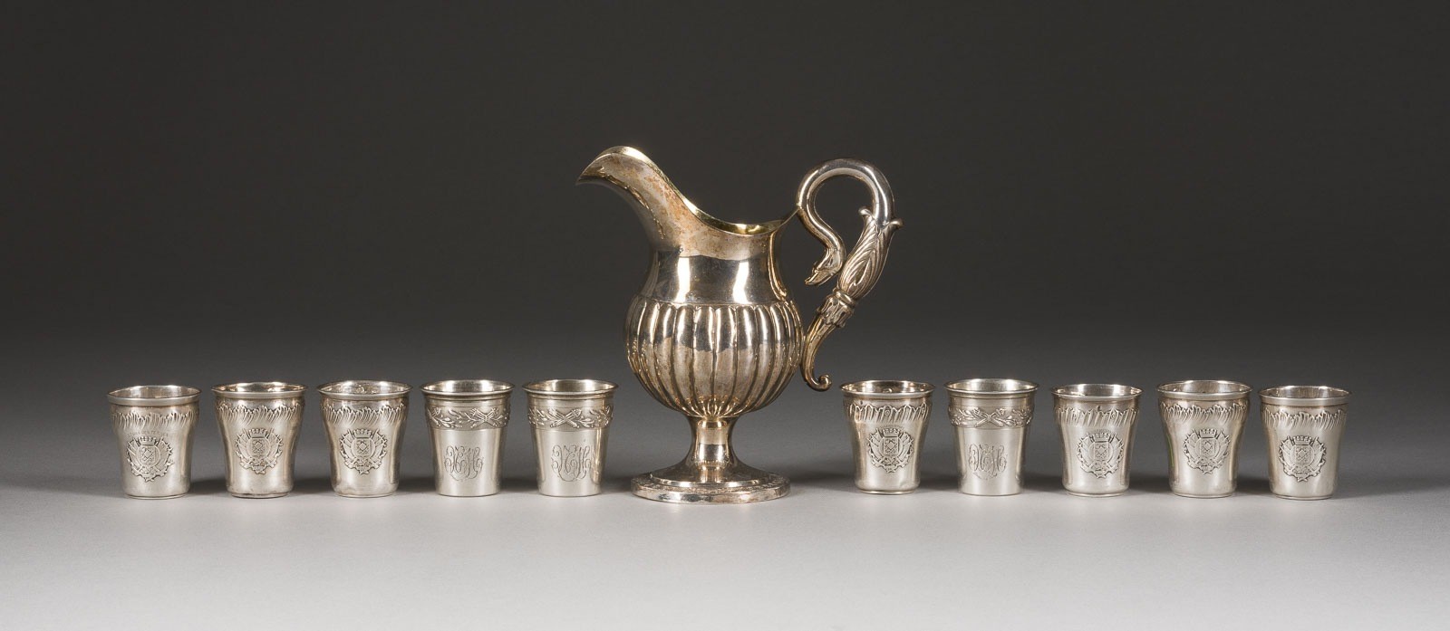Silber, part. Innenvergoldung. H. 4 cm (Becher), H. 13 cm (Kännchen), Ges.-Gew. 210 g. Punziert mit Minervakopfmarke, wohl Bärenmarke (undeutlich), Feingehalt 'A800', 'A'. Teilw. Besitzermonogramm und Wappe mit Inschrieft 'ETOILE DES TERNES'. Min. Oberflächenkratzer.