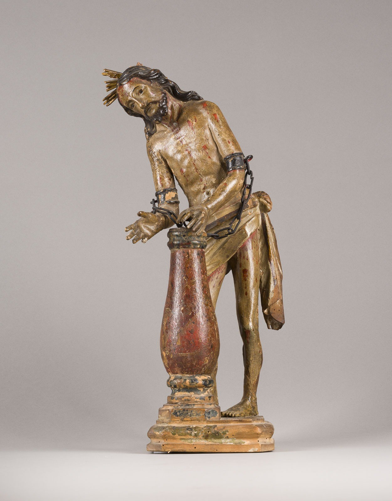 IGNAZ GÜNTHER 1725 Altmannstein - 1775 Munich (or circle) CHRIST AT THE COLUMN OF THE SCORCHING Bavaria, around 1750/60 Wood, sculpted, gilded, polychrome finish, flattened on the back. H. 45.6, W. 17, D. 16 cm, weight approx. 1.1 kg. Marked on the underside, probably Ignatz Güther or vicinity. Partially preserved, loss of material, damaged, rest., woodworm infestation on the reverse.