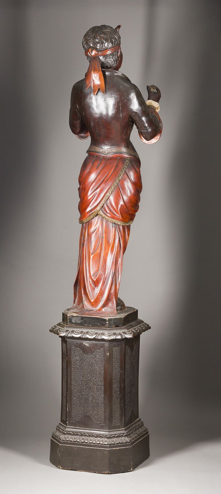 LARGE STANDING DEVIL FIGURE Venice, 19th/20th century Wood, fully sculpted, polychrome finish, on a pedestal base. H. 189, W 44, D 38 cm. Large-scale devil figure in a folk style with theatrical clothing including a ruffled shirt and candle holder, characteristic hoofed feet, and expressive physiognomy. Partially bumped, loss of paint, rest.