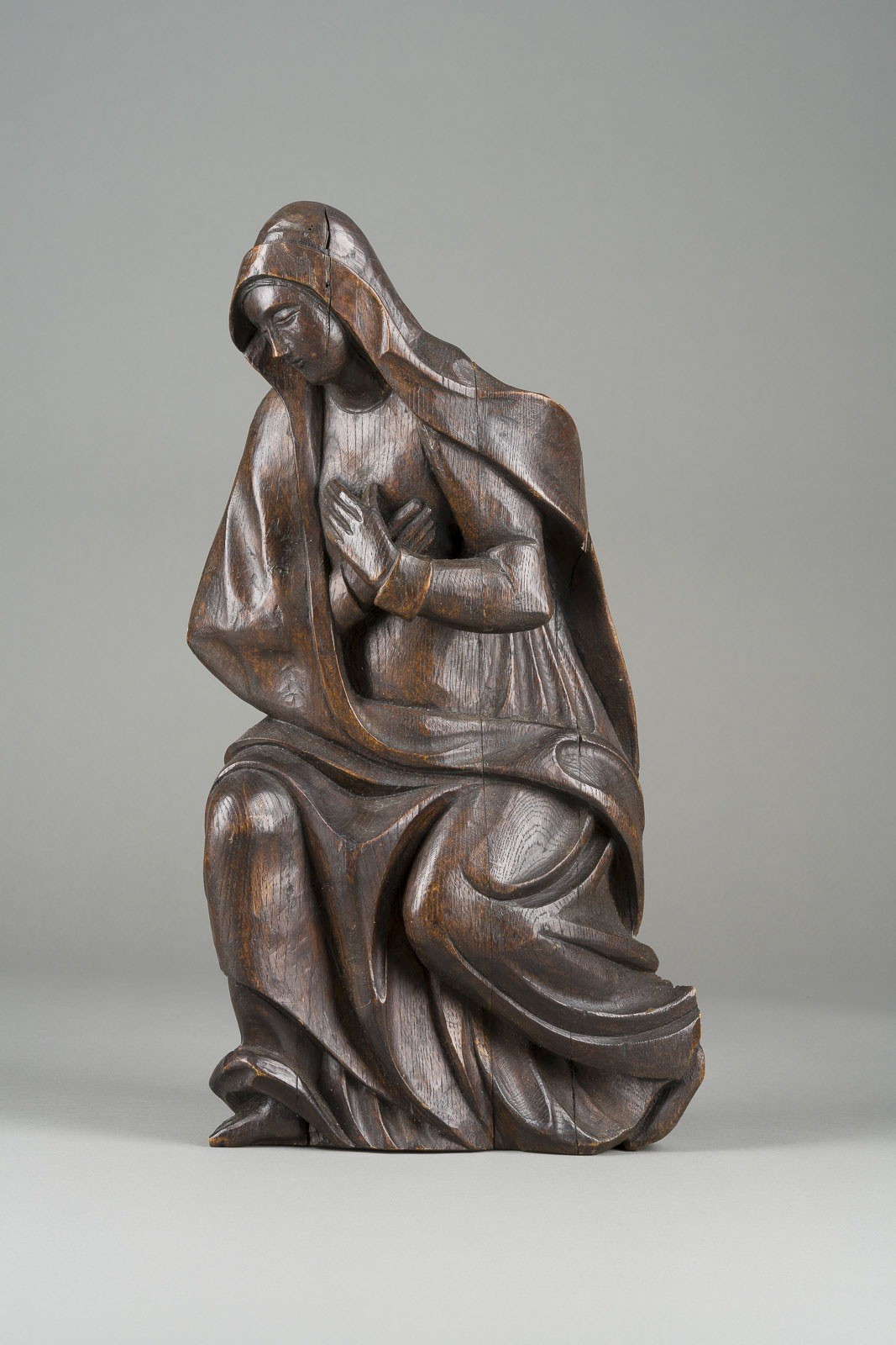 MARY FROM A CRUCIFIXION GROUP Flanders, 16th century Oak, carved in relief, dark stained, flattened on the back. H. 50, W. 26, D. 9 cm. Partially damaged, stress cracks.