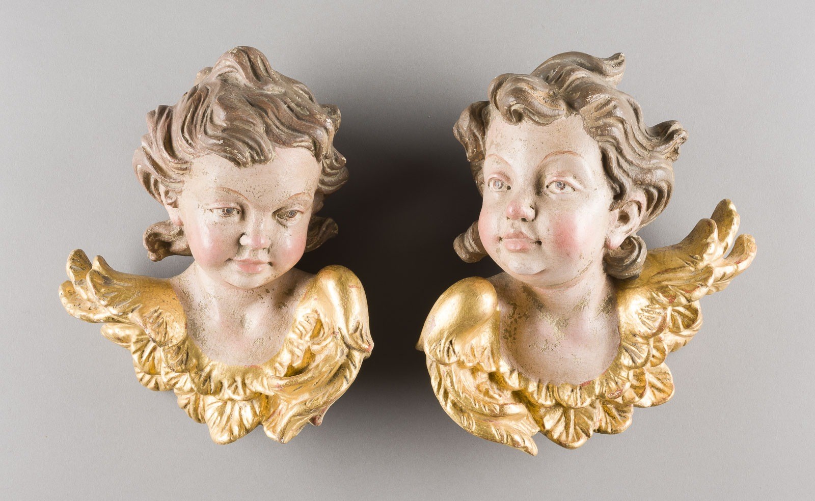 PAIR OF WINGED CHERUB HEADS Southern Germany/Austria, 18th century Wood, sculpted, gilded, polychrome finish. H. 27/28 cm each, W. 23/24 cm, D. 16/15.5 cm. Partially bumped, some loss of material.
