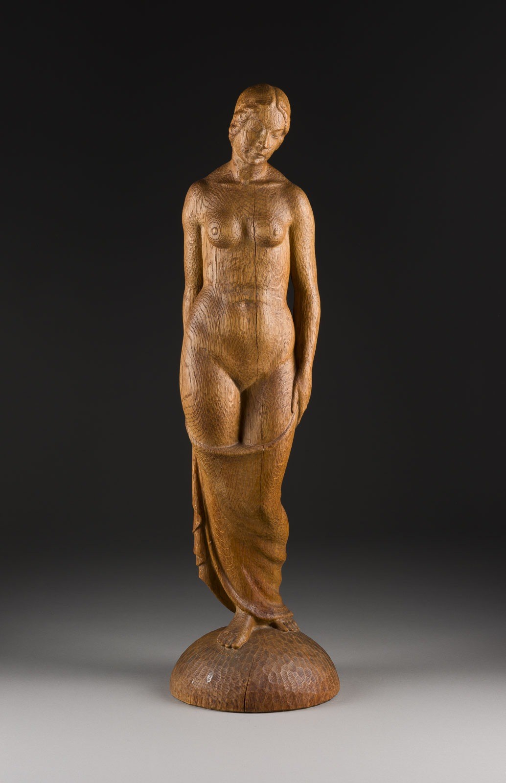 OSKAR WILHELM DEUS 1889 - 1964 German sculptor STANDING FEMALE NUDITY Wood, carved in the round, waxed, on a round base. Total height 77 cm, width 22 cm, depth 21 cm, weight approx. 4.79 kg. Signed 'W. Deus' on the side. Minor damage, stress crack.