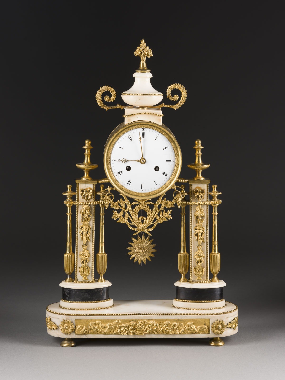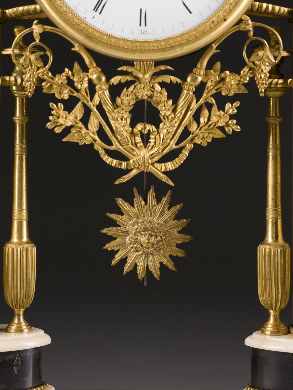 DIRECTOIRE PORTAL CLOCK France, late 18th century Marble, bronze, gilt, enamel, metal, steel. 56.5 x 36 x 11 cm. Rectangular base with rounded edges and gilt bronze appliqués on four bronze feet. Bronze-decorated columns. White enameled dial with Roman and Arabic numerals and ornamental hands. Vase finial. Partially damaged; function untested; with key and sun pendulum.