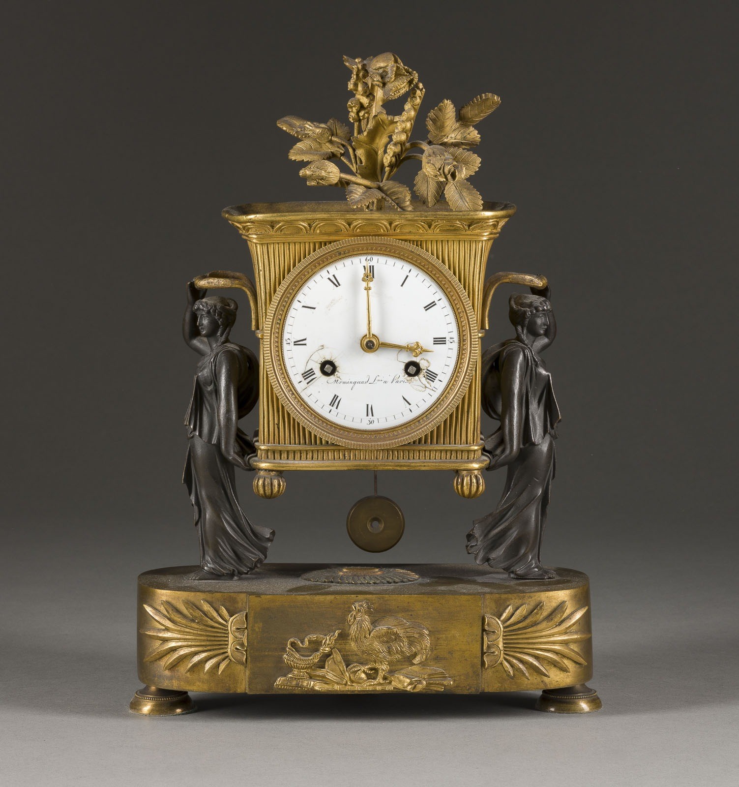 EMPIRE CLOCK France, Paris, Armingaud l'Ainé (mentioned 1806 - 1813), circa 1810 Bronze, metal, partially gilt, partially dark patinated, enamel, steel. 31 x 21 x 8 cm. Inscribed 'Armingaud Lné à Paris' on the dial. Partially damaged, chipped and repaired. Functionality untested. With pendulum and key. Provenance: Aristocratic estate.