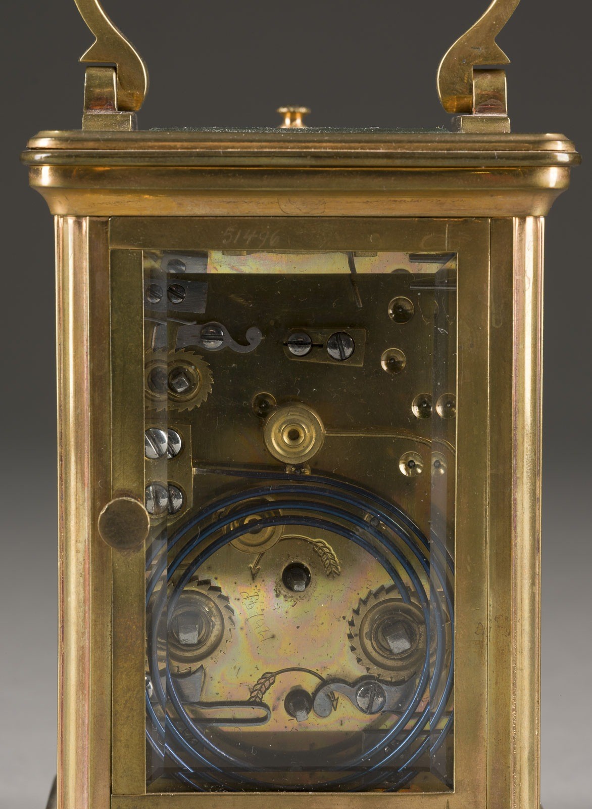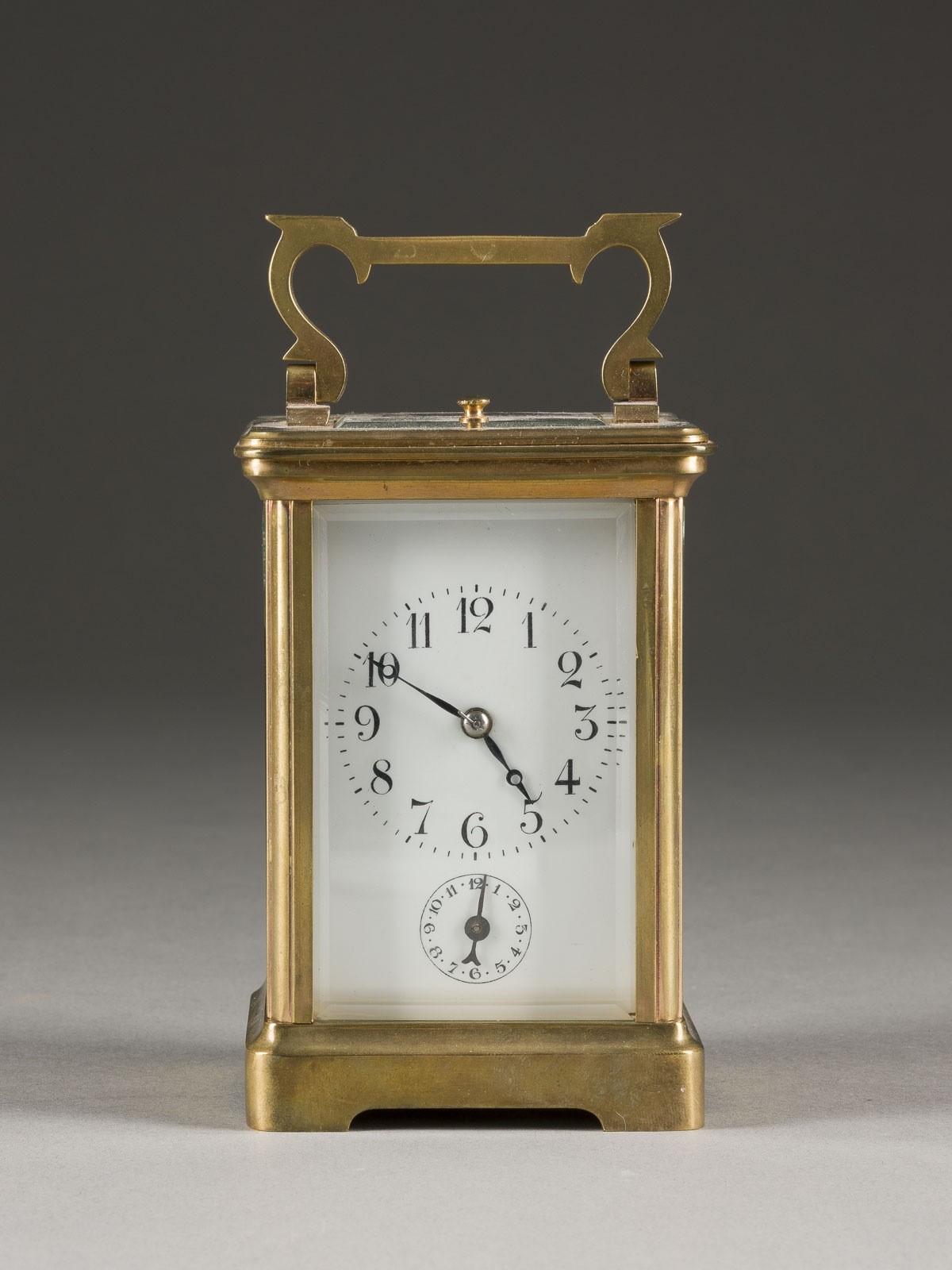 TRAVEL WATCH WITH ALARM CLOCK Late 19th century Brass, glass, steel, enamel. 13 x 7.5 x 7 cm. Fully glazed brass case with carrying handle, enamel dial with Arabic numerals, alarm scale at the bottom, blued hands. Signs of wear, function untested, with key.