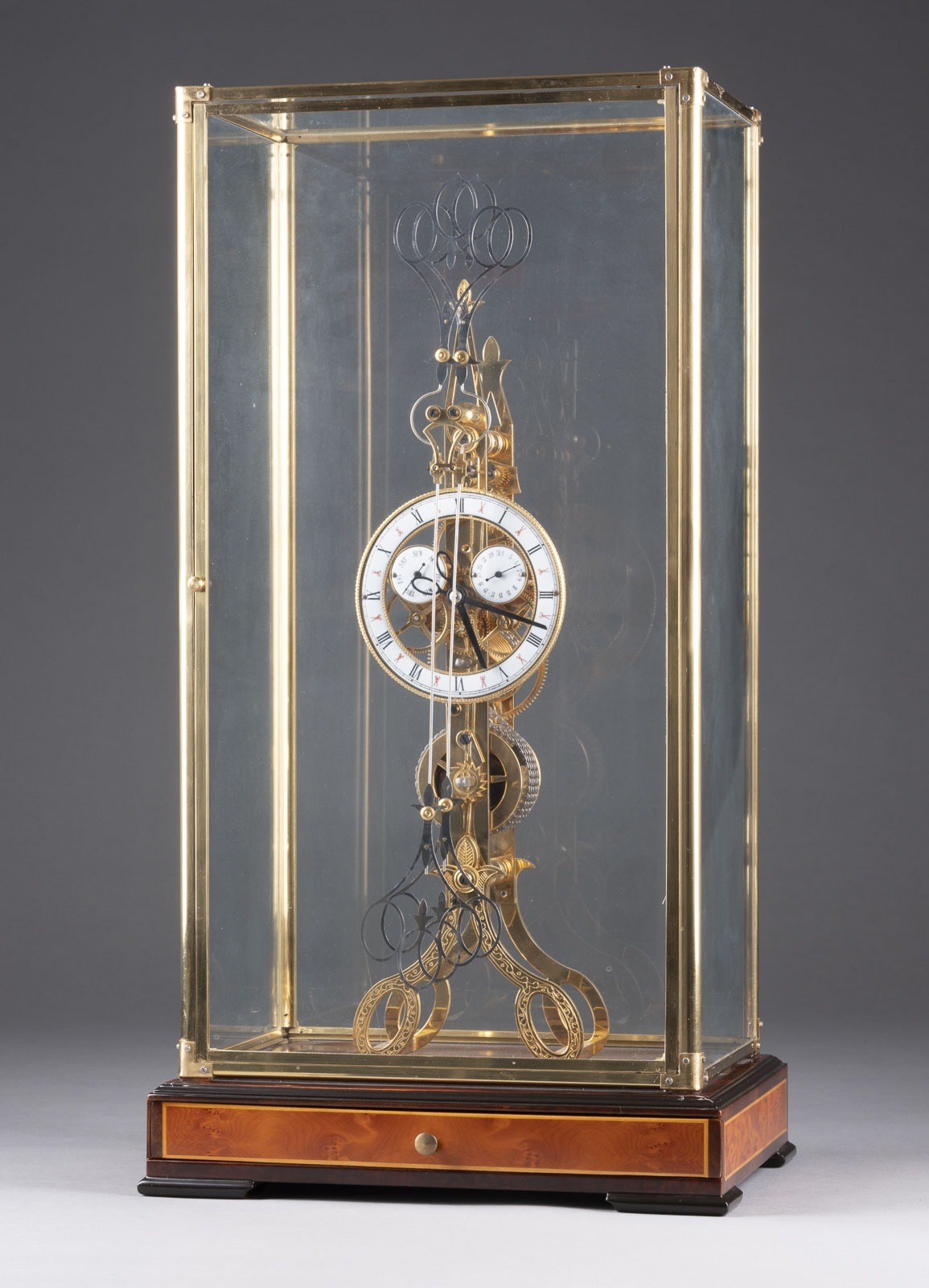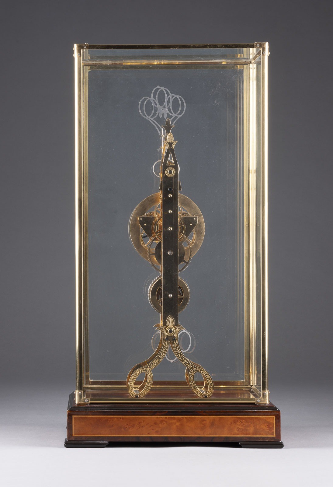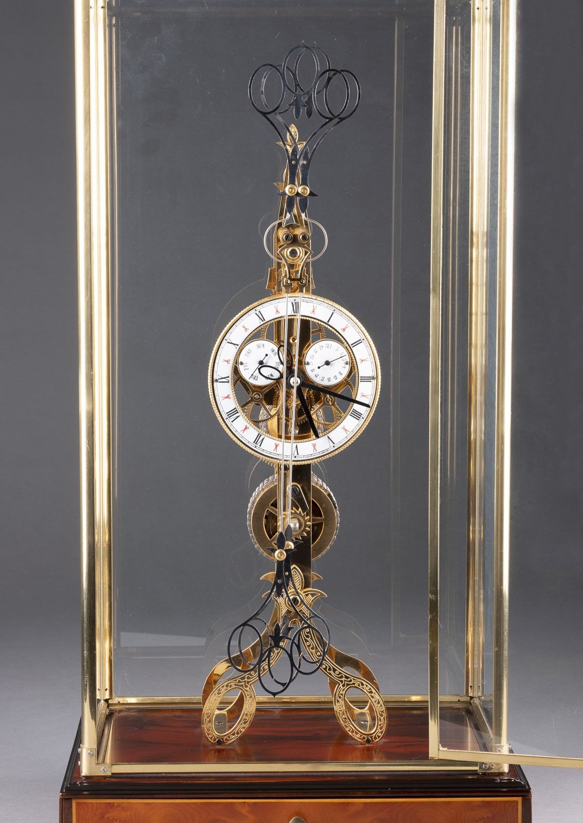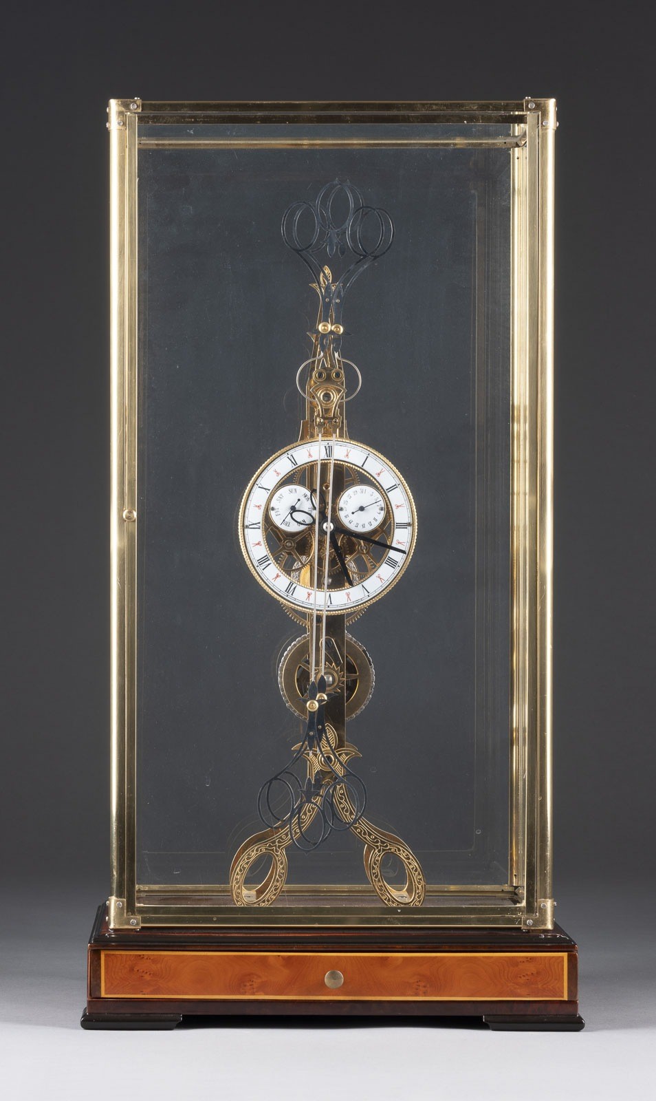 RARE SCISSORS CLOCK 20th century Wood, brass, gilt, steel, metal, glass, enamel. 64 x 34.5 x 24.5 cm (with case), 51.5 x 14 x 12 cm. Wooden base with front drawer and glass dome with door. Two counter-rotating pendulums in a scissor mechanism. Enameled dial with Roman numerals, date and day display. Signs of wear, function untested, with key.