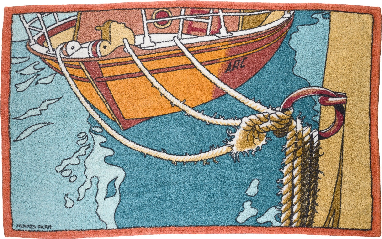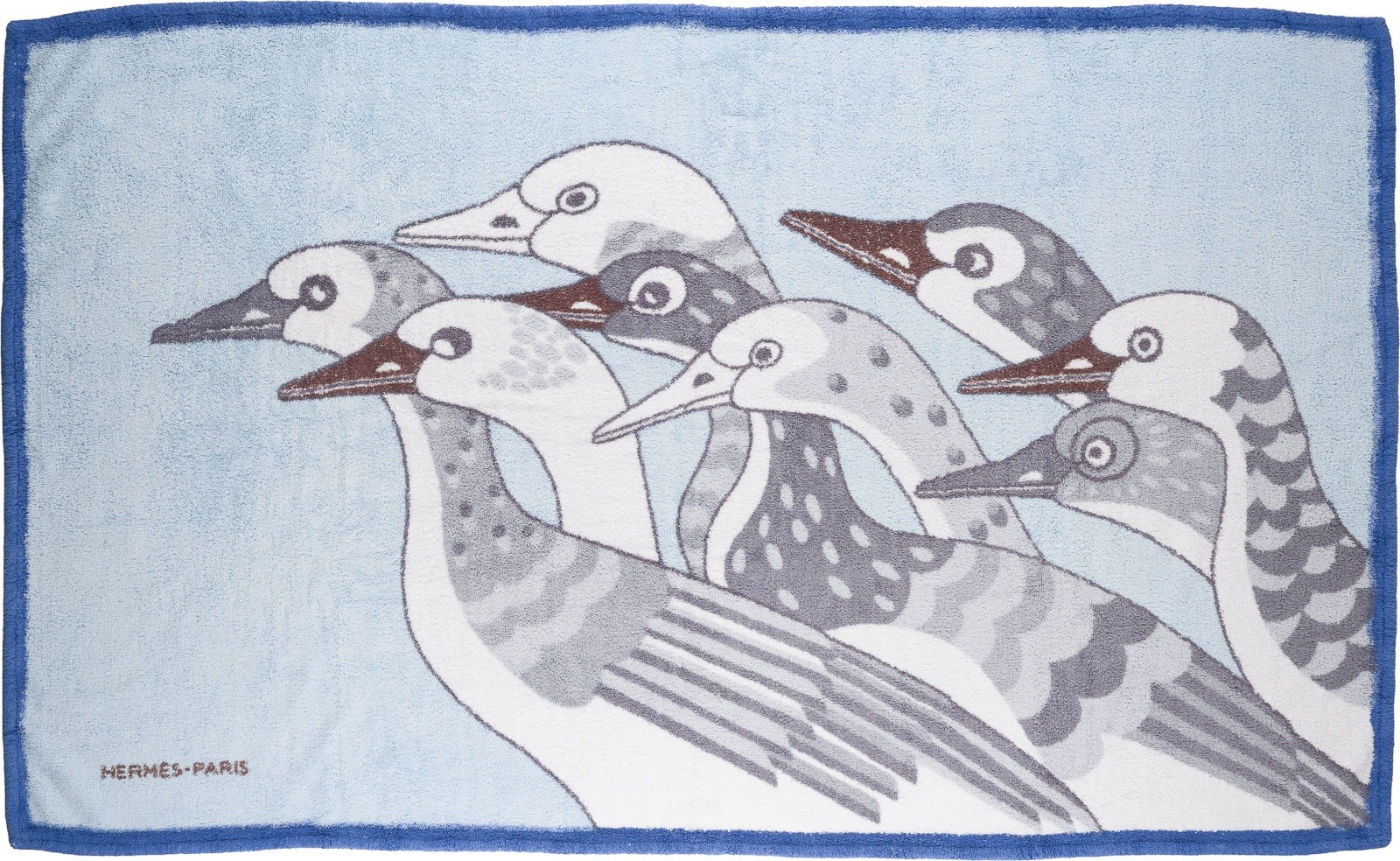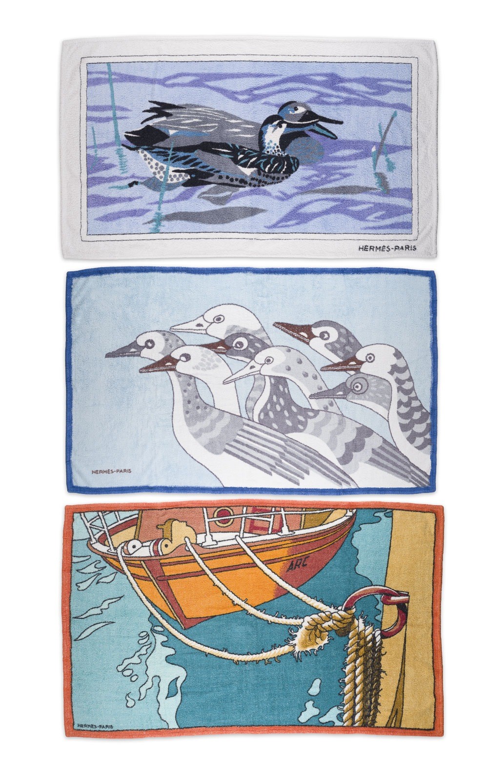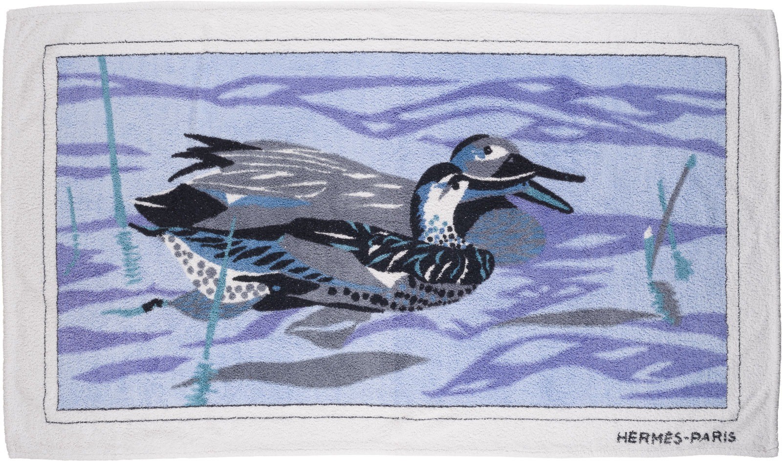 Baumwollfrottier, polychromer Dekor. Jew. 140 x 85 cm. Jew. bez. 'Hermés Paris', zwei Tücher mit Pflegeetikett. Sehr min. Gebrauchsspuren, Farbe teils verblasst.