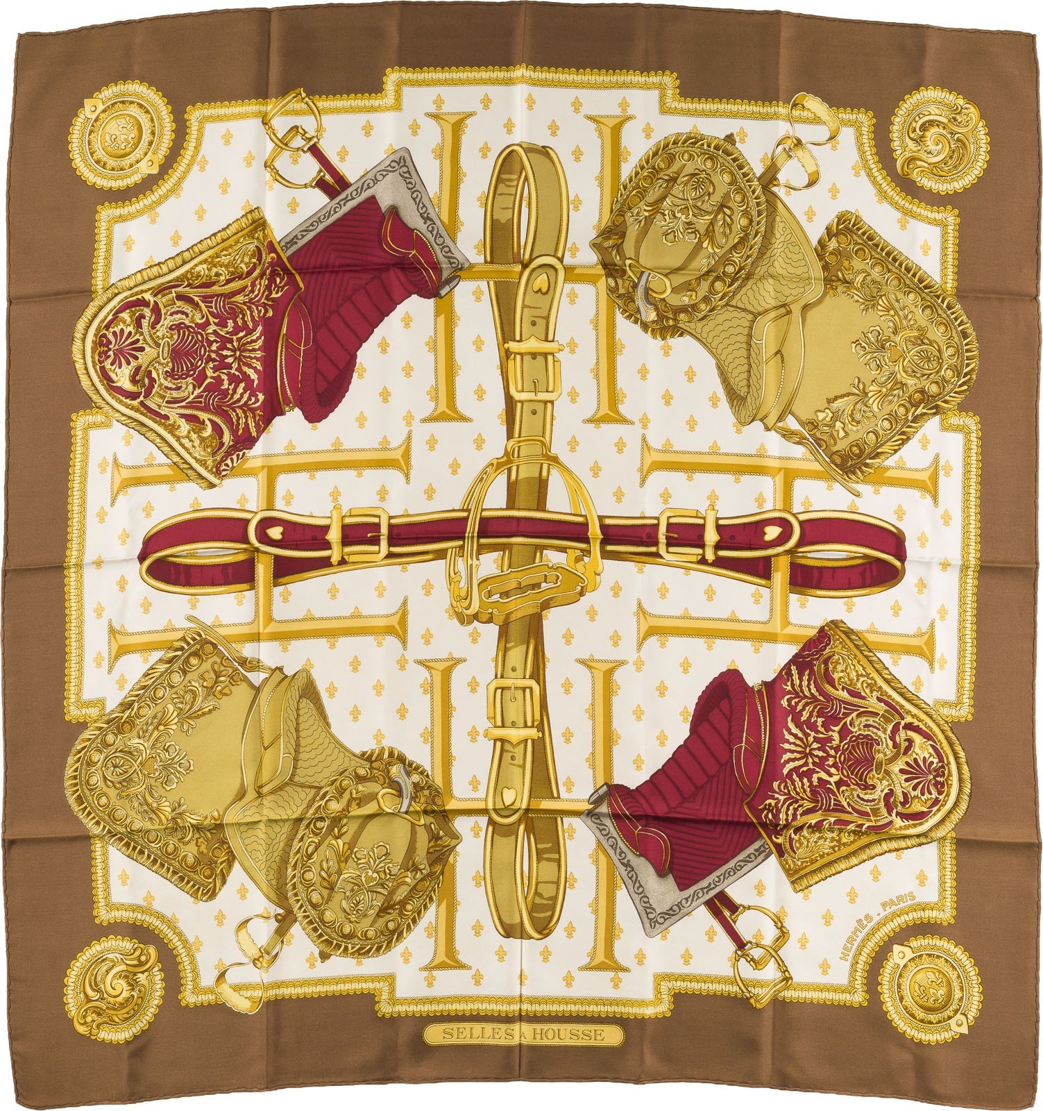 Seide, rollierter Saum, Sättel-Dekor auf dem Fleur de Lys Hintergrund mit braunem Rand. 90 x 90 cm. Bez. 'Hermés Paris' sowie betitelt, ohne Pflegeetikett. Kleines Loch oben rechts.