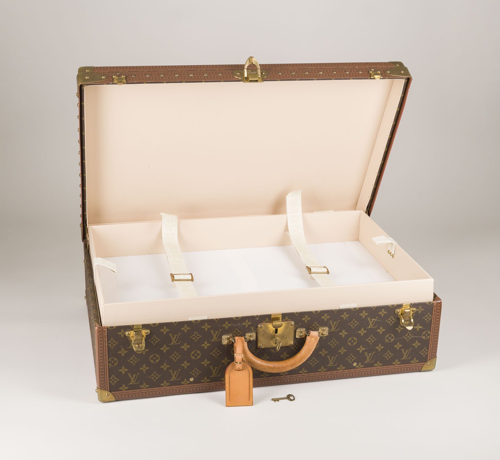 Monogram-Canvas, Leder, Messing. L. 70 H. 47 B. 22 cm. Auf der Verschlussplatte bez. 'Louis Vuitton', 'Made in France' sowie die Nummer '1201394', innen die Serien-Nr. '1012130'. Das traditionelle Reisegepäck mit herausnehmbarem Innenfach und Adressanhänger. Schlüssel