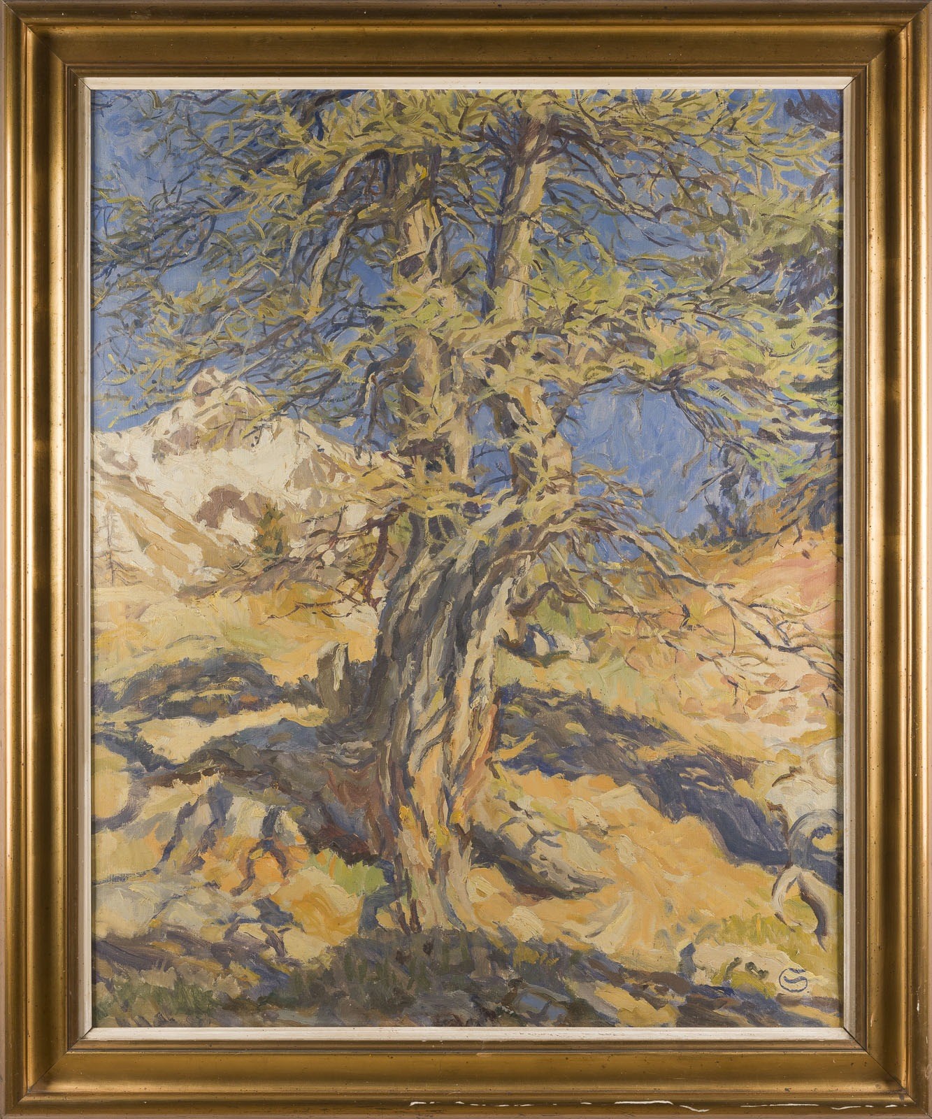 Öl auf Leinwand. 99 x 79 cm (R. 114 x 95,5 cm). Unten rechts monogrammiert. Verso: auf dem Keilrahmen bezeichnet 'R. Siegmund, Speele Piz Languard 1932'. Rahmen.