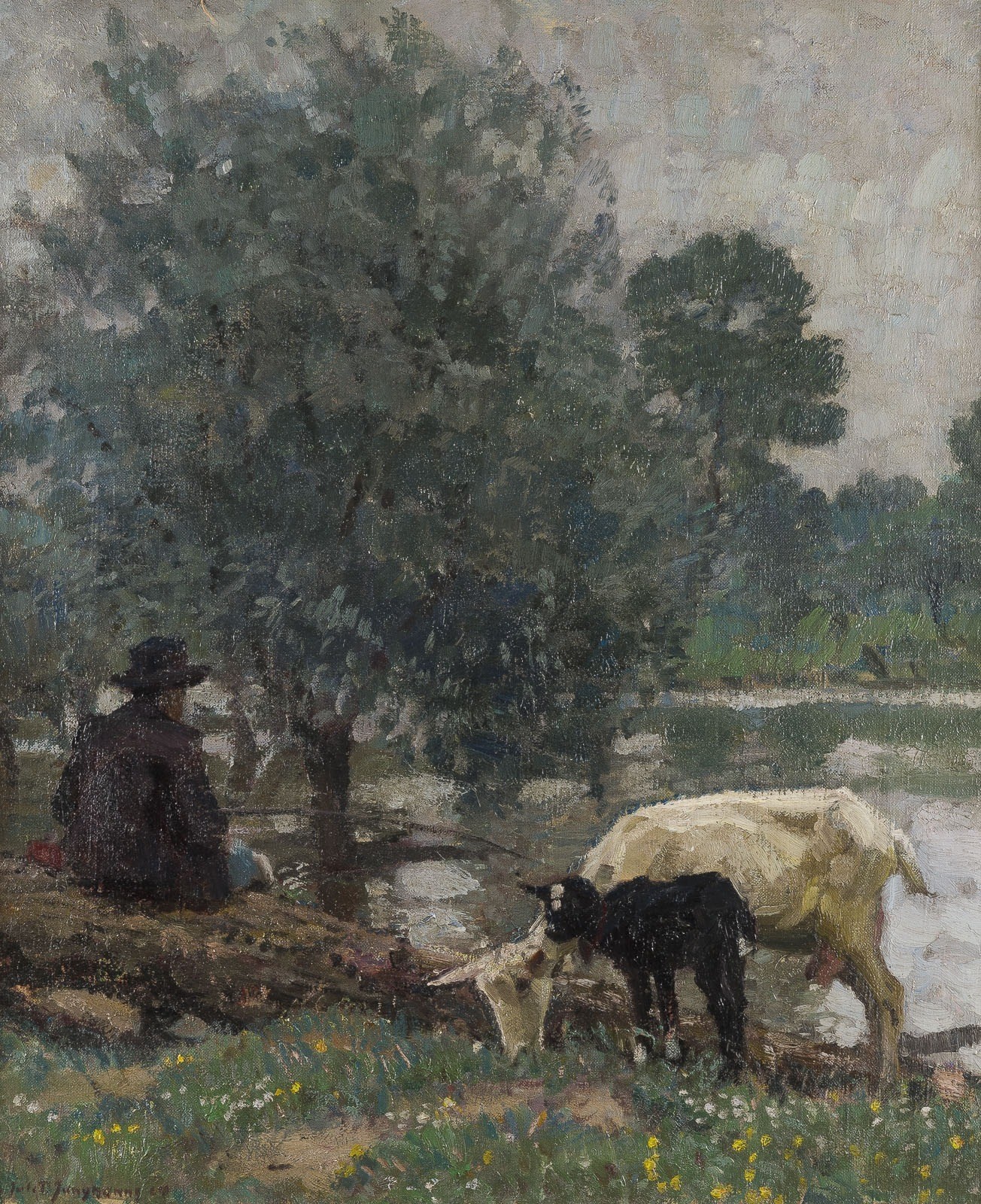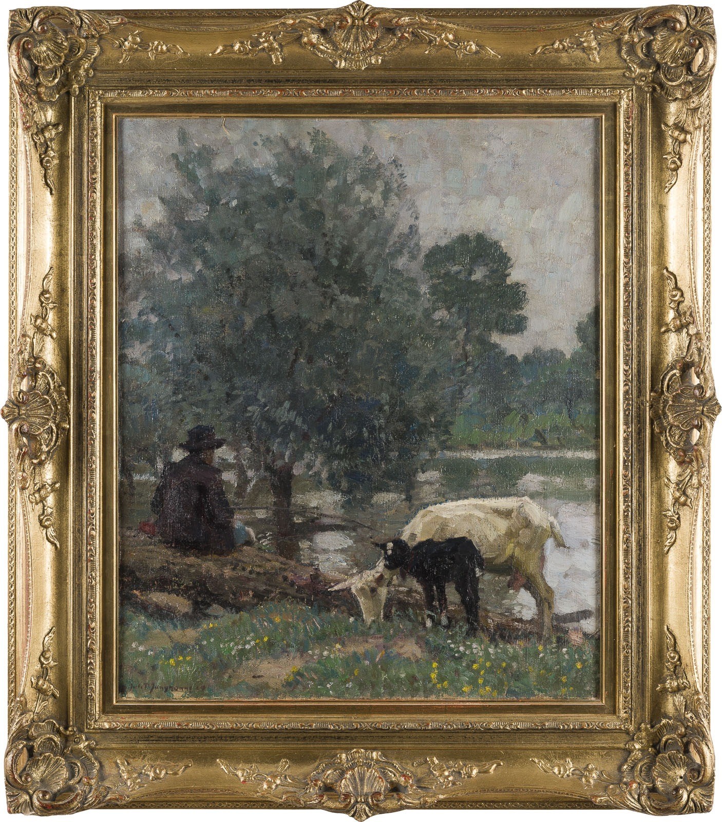 Julius Paul Junghanns war ein deutscher Maler, der vor allem durch seine Tier- und Landschaftsdarstellungen Bekanntheit erlangte. Geboren am 8. Juni 1876 in Wien, wuchs Junghanns in Dresden auf, wo er zunächst eine Ausbildung zum Lithografen absolvierte und anschließend an der Kunstgewerbeschule sowie an der Akademie der Bildenden Künste studierte. Ab 1899 setzte er seine Ausbildung an der Akademie in München fort, in der Klasse des renommierten Tiermalers Heinrich von Zügel - eine entscheidende Phase für seine künstlerische Entwicklung. 1904 wurde Junghanns an die Kunstakademie Düsseldorf berufen, wo er später als Professor und Leiter der Meisterklasse für Tier- und Freilichtmalerei tätig war. Neben seiner Lehrtätigkeit war er regelmäßig auf Ausstellungen vertreten und wurde mehrfach ausgezeichnet. Die hier angebotenen fünf Gemälde stammen aus einer privaten Sammlung und datieren aus der Zeit von 1901 bis 1920. Sie dokumentieren sowohl den frühen Einfluss seines Lehrers Zügel als auch die eigenständige Handschrift des Künstlers in seiner späteren Schaffensphase.