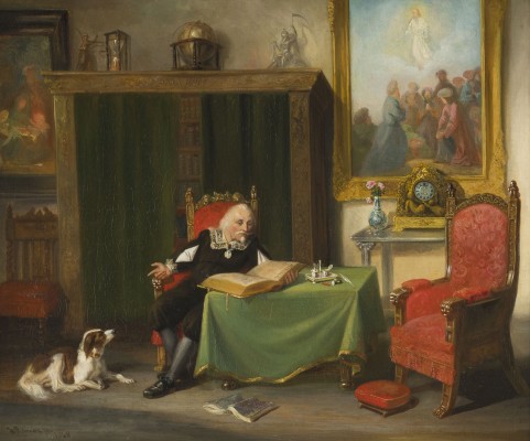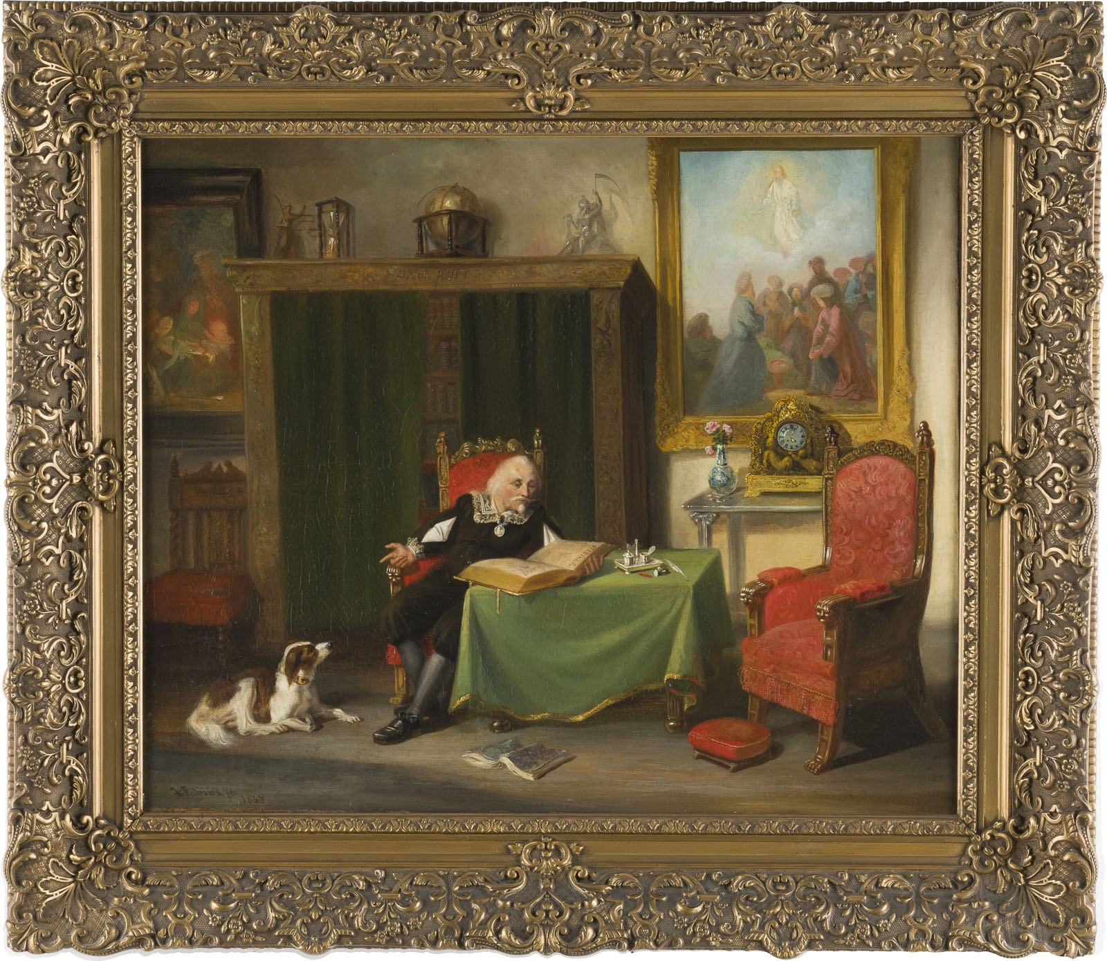 HERR MIT HUND IN EINEM PRÄCHTIG EINGERICHTETEN INTERIEUR. 1868