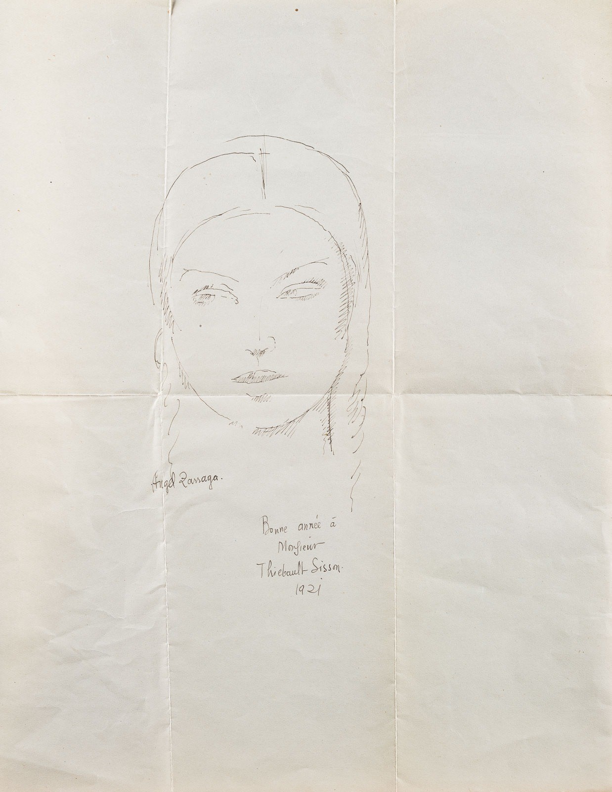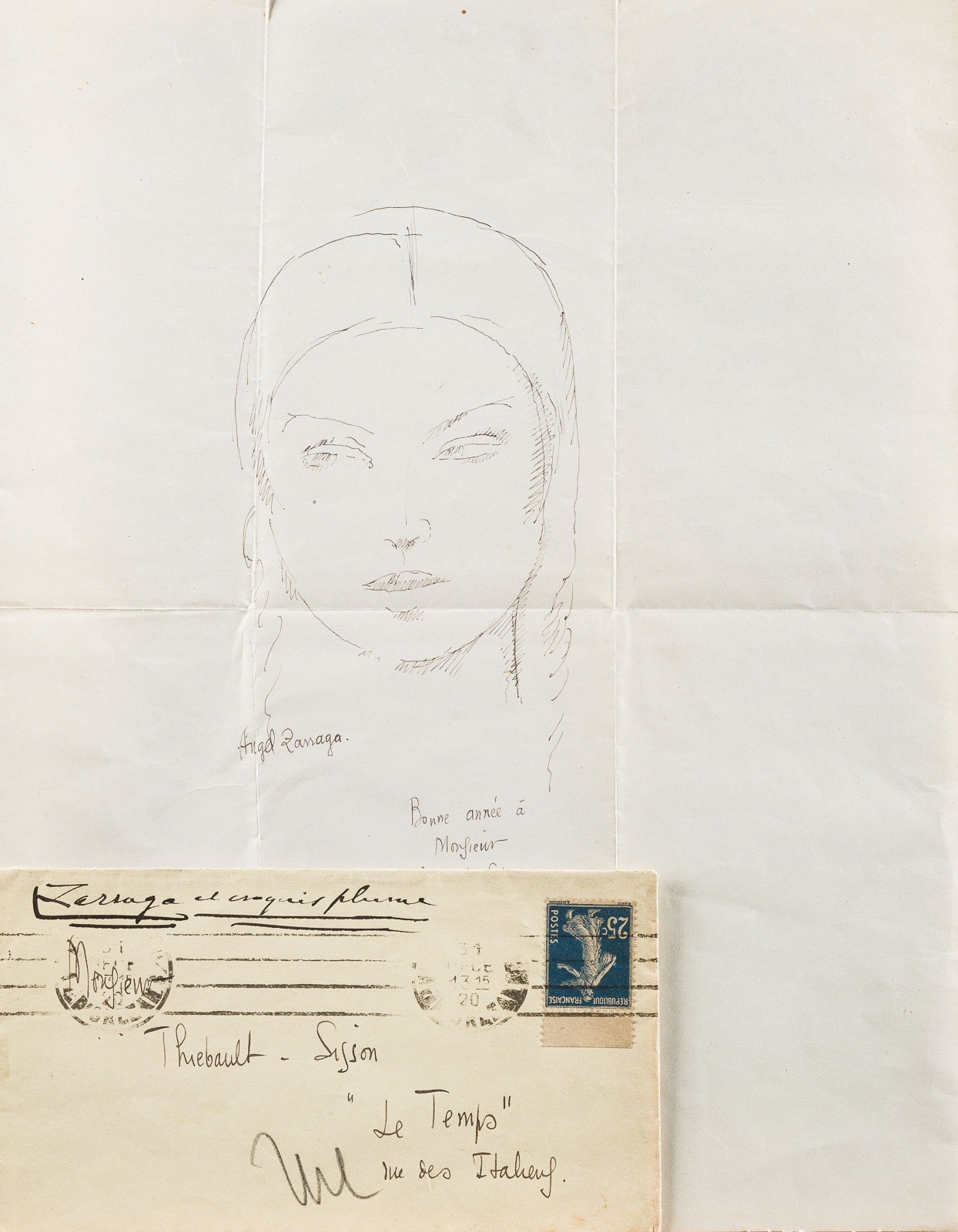 Tuschezeichnung auf bläulichem Papier, mit Orig.-Briefumschlag (8 x 14,5 cm) an Thiebault-Sisson mit Marke und Poststempel. 27 x 21 cm. Unten links signiert 'Angel Zarraga' und mit Widmung unten Mitte 'Bonne année à Monsieur Thiebault-Sisson 1921'. Part. leicht gebräunt, Randbesch., Horizontal- und Vertikalknicke.