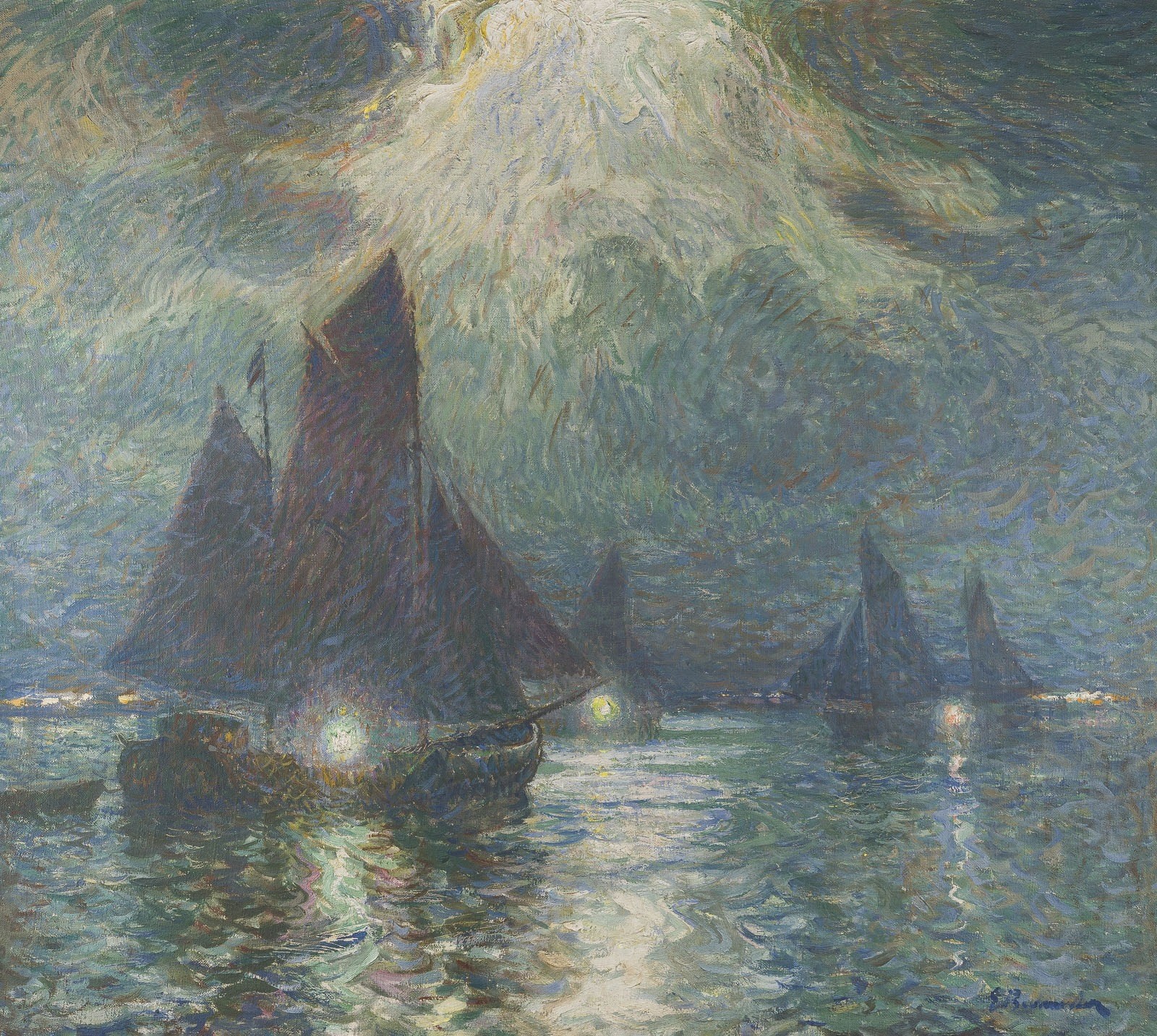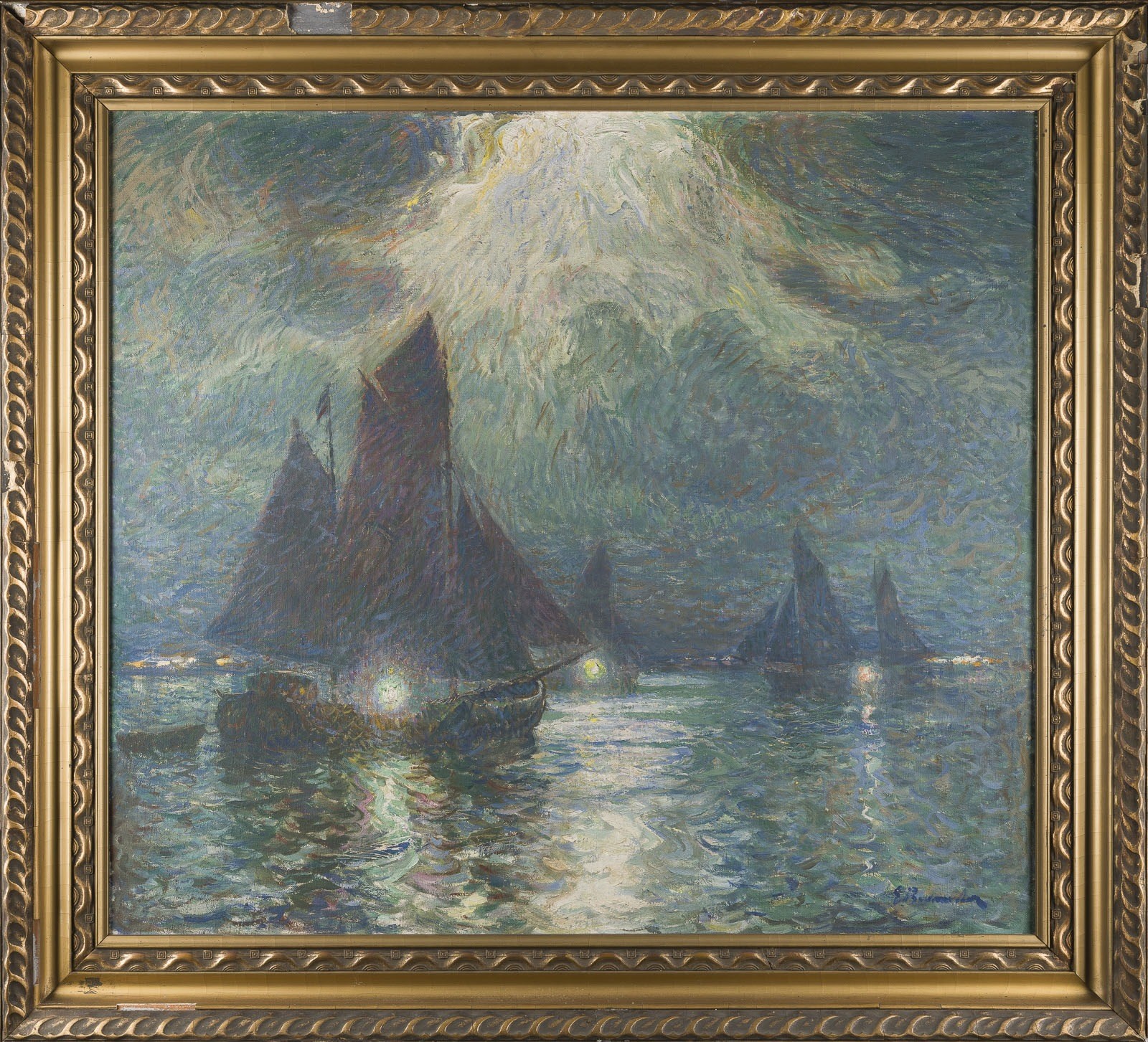 Georg Burmester war ein leidenschaftlicher Vertreter der Freilichtmalerei, näherte sich jedoch in einigen wenigen Werken einer expressiveren Bildsprache an. Das vorliegende Gemälde stellt ein seltenes Beispiel dieser Entwicklung dar. Das Licht bleibt hier - wie im Impressionismus - der eigentliche Protagonist, doch handelt es sich nicht mehr um ein Licht, das mit einem fotografischen oder rein naturalistischen Ansatz erfassbar wäre. Vielmehr begegnen wir dem Effekt einer mitternächtlichen nordischen Sonne, die einen fantastischen Landschaftsraum erzeugt. Mehrere Lichtquellen formen eine spannungsvolle und vielschichtige Atmosphäre. Besonders unheimlich wirkt das Licht, das von oben aus dem Zentrum der Komposition herabströmt: fließende, gerichtete Pinselstriche machen diese Erscheinung beinahe taktil erfahrbar. Eine zweite Lichtquelle bilden die Lichter der Boote unter dunklen Segeln, die sich mühsam durch den dichten Nachtschatten brechen. Die dritte entsteht in den Reflexionen auf der Wasseroberfläche, dargestellt durch flirrende Striche und sich ausbreitende Linien, die Bewegung und Unsicherheit verstärken. Die Natur erscheint hier eindeutig romantisch und nicht realistisch aufgefasst - geprägt von einem Gefühl der Unruhe, der Einsamkeit und der Ahnung des Schicksals, zugleich jedoch von einer tief berührenden, fast magischen Schönheit.