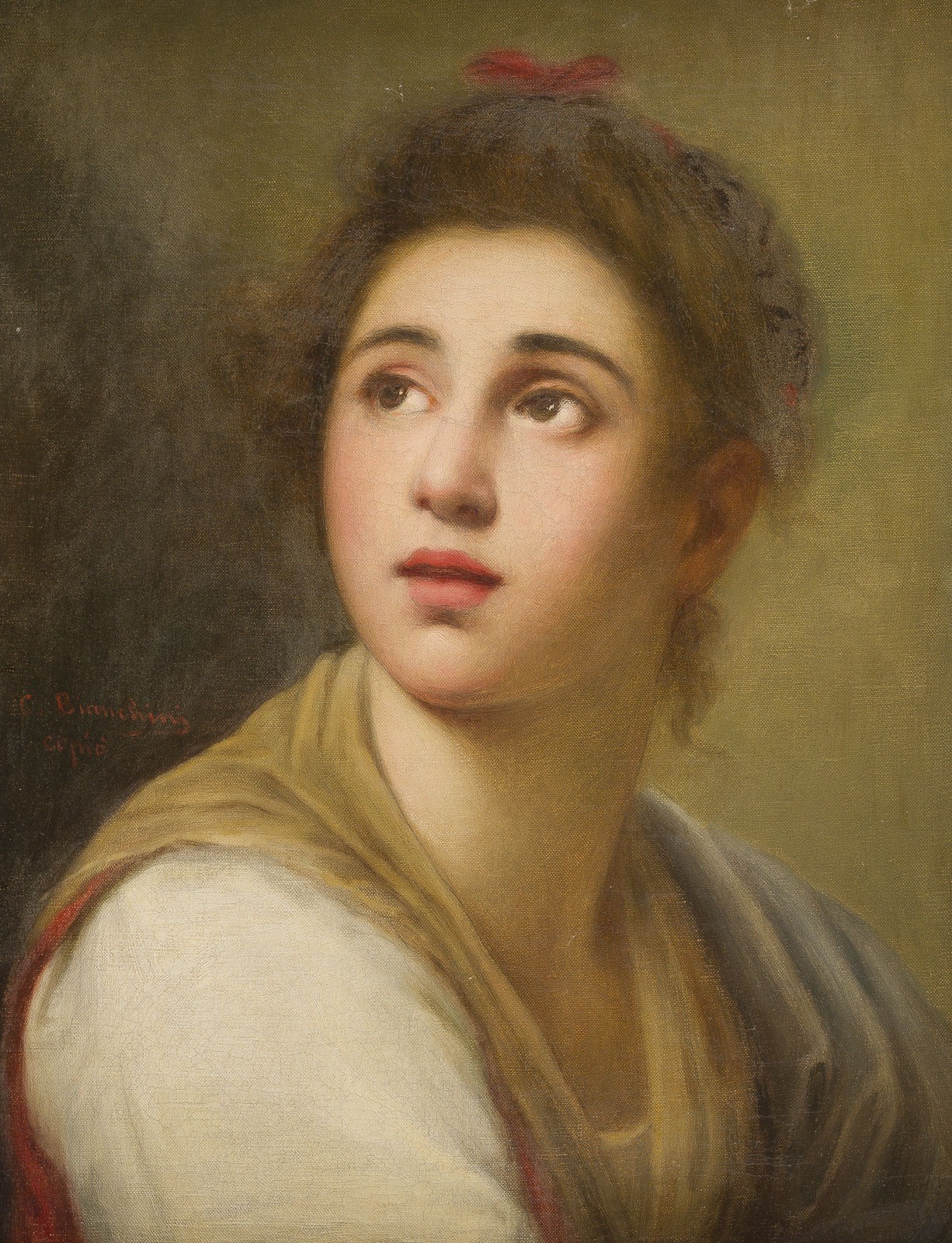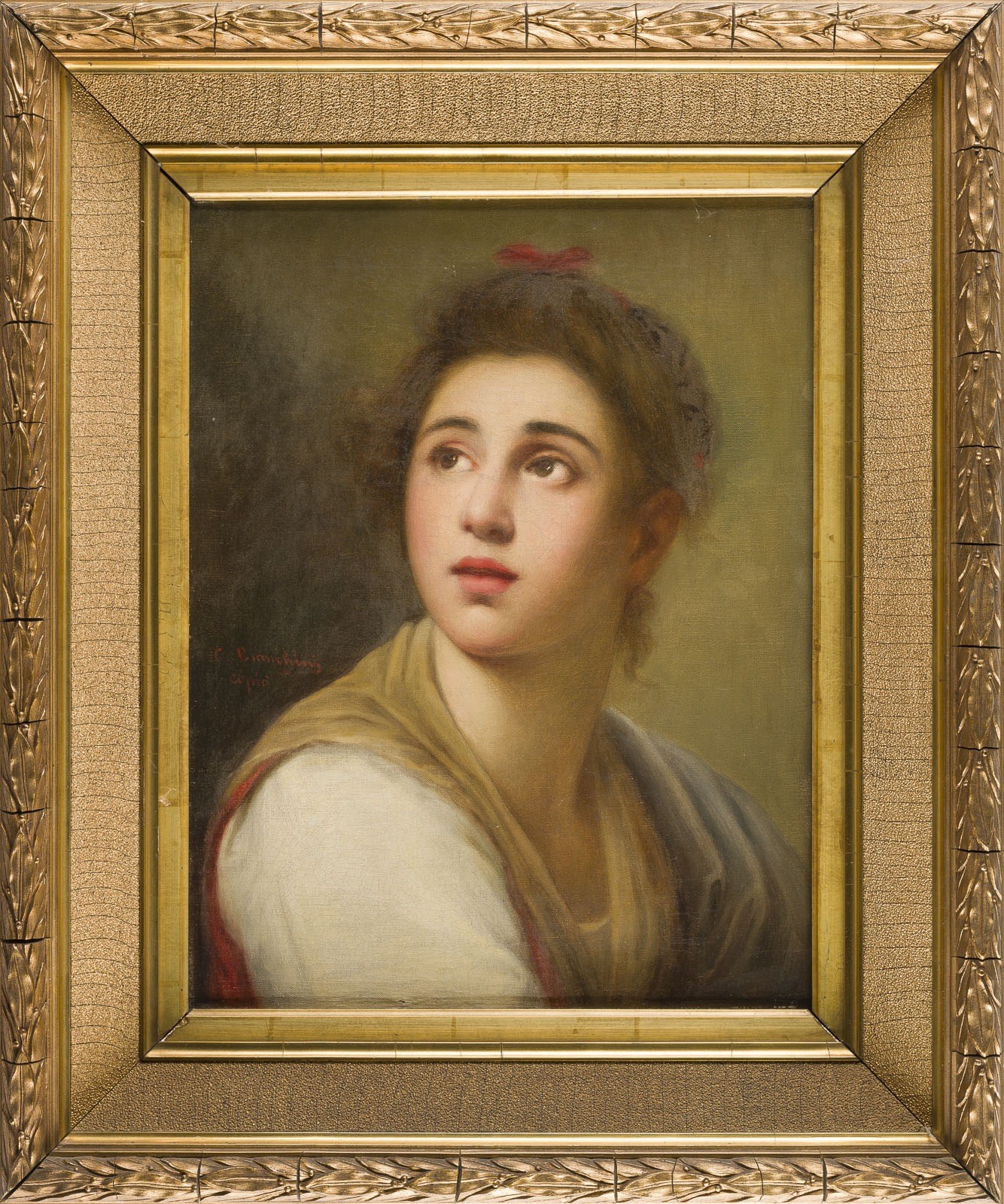 Öl auf Leinwand. 42 x 33 cm (R. 60 x 50 cm). links signiert 'C. Bianchini copio'. Verso: Auf der Leinwand ein Siegelstempel der Galerie Barberini. Rahmen (mit Herstellersetikett: Louis Bock & Sohn, Hamburg).