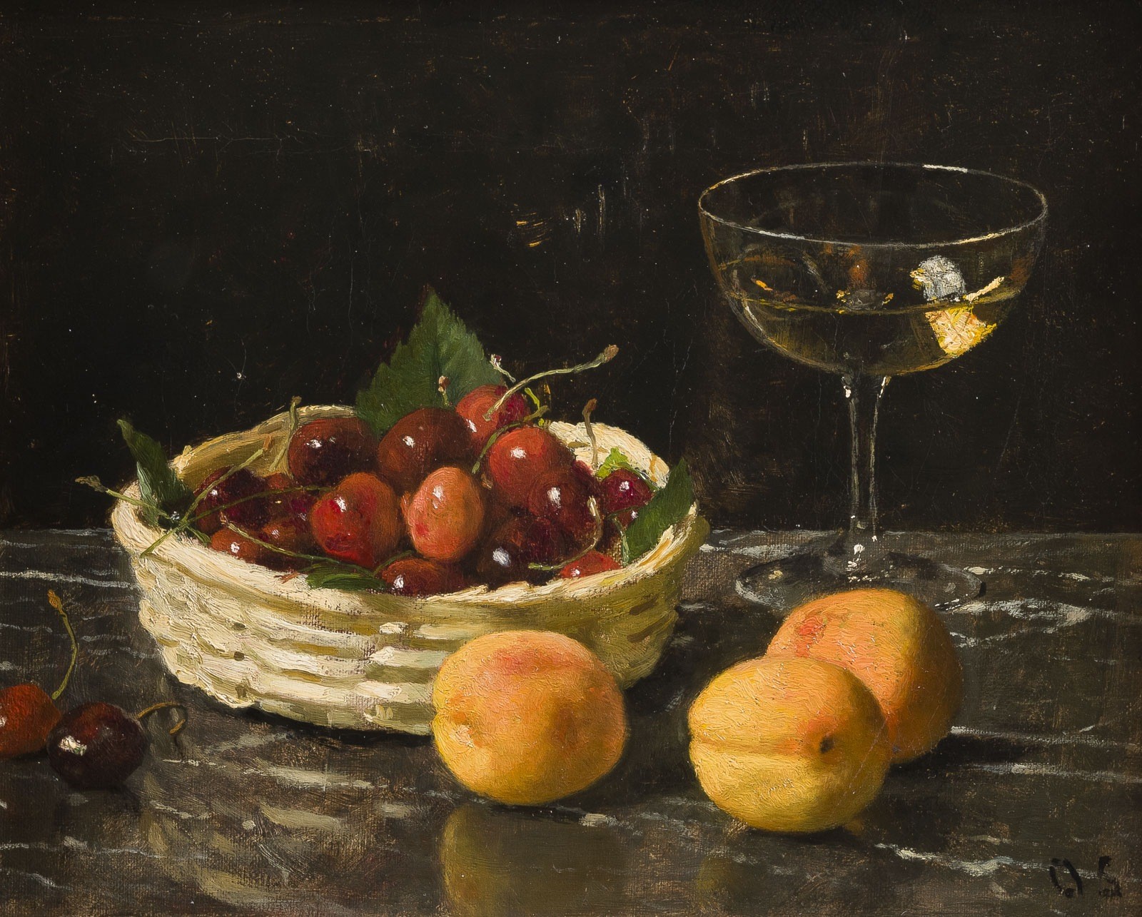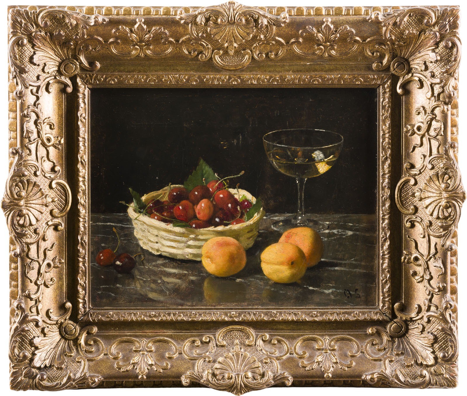 Otto Scholderer zählt zu den bedeutenden Malern des 19. Jahrhunderts, der als wichtige Verbindung zwischen deutscher Tradition und den neuen Strömungen der französischen Schule gilt. Entscheidend für seine Entwicklung waren seine Pariser Aufenthalte Ende der 1850er Jahre, wo er Freundschaften mit Henri Fantin-Latour und Édouard Manet schloss. Fantin-Latour verewigte ihn später in dem berühmten Gruppenbild L'Atelier des Batignolles (1870), in dem Scholderer im Kreis von Monet, Renoir und Bazille dargestellt ist. Seine Stillleben zeichnen sich durch besondere Feinheit und eine seltene, in Deutschland kaum erreichte Kultur der Leichtigkeit aus. Werke Scholderers befinden sich heute in den bedeutendsten europäischen Museen und gelten als begehrte Zeugnisse des Übergangs von der Romantik zum Impressionismus. Vor uns liegt ein ikonographisches Stillleben Otto Scholderers aus der Zeit um 1890, das für seine reife pariserisch-londoner Phase exemplarisch ist. Die Komposition mit dunklem, neutralem Hintergrund, marmorener Standfläche, Weinglas und Früchten entspricht in allen formalen und inhaltlichen Aspekten jenem stabilen Typus, den Jutta M. Bagdahn als charakteristisch für Scholderers Stillleben beschreibt. Die Gegenstände sind auf einer nahezu bühnenhaften Ebene angeordnet und mit fast porträthafter Individualisierung wiedergegeben; die feinsinnige Erfassung der Stofflichkeit - das durchscheinende Glänzen des Glases, die samtige Haut der Früchte und die kühle Glätte des Marmors - gehört zu den zentralen Qualitäten dieser Werkgruppe. DDie vorliegende Arbeit entspricht in Komposition und Motiv bis in die kleinsten Details der im Werkverzeichnis unter Nr. 316 aufgeführten Komposition (Stillleben mit Korb und schwarzen Kirschen, halbgefülltem Weinglas und Pfirsichen), abgebildet auf S. 632, Jutta M. Bagdahn. Monografie und Werkverzeichnis.