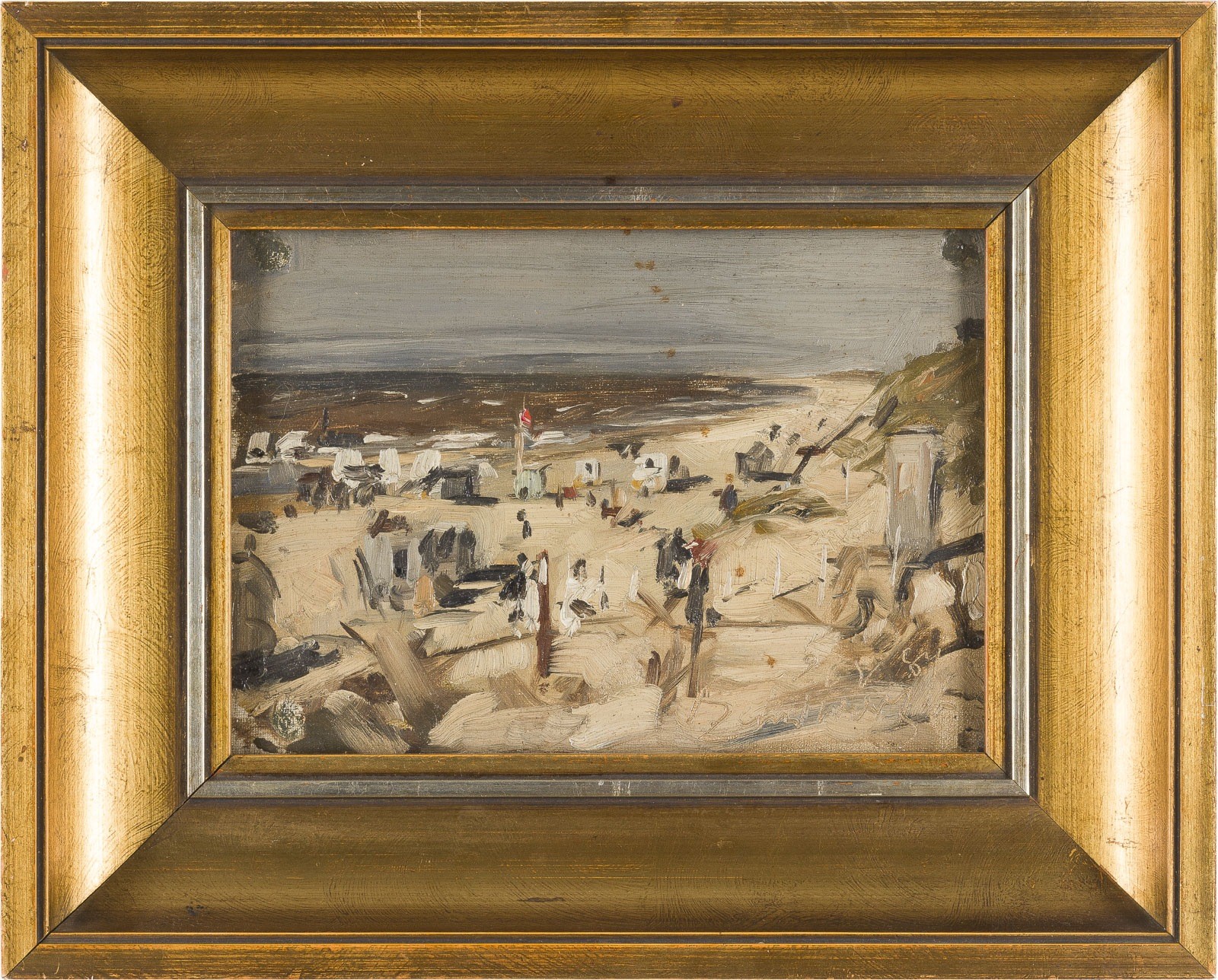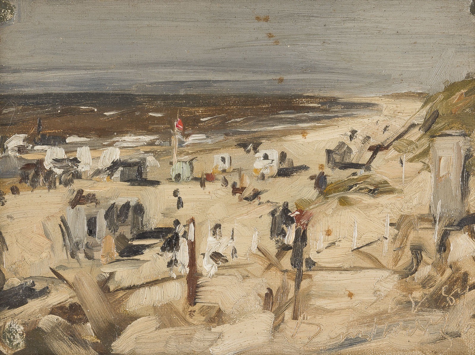 Dargestellt ist ein Strandabschnitt von Zandvoort, leicht erhöht betrachtet. Der sandige Uferbereich ist von zahlreichen Figuren bevölkert, die mit einem freien, leichten Pinselduktus ausgeführt wurden. Komposition und Malweise deuten darauf hin, dass es sich um eine unmittelbar im Freien entstandene Studie handelt - vermutlich daher auch ohne Signatur. Stil, impressionistische Herangehensweise an das Motiv sowie die Themenwahl sind typisch für Künstler der ersten Generation des Impressionismus. Besonders bemerkenswert ist, dass Max Liebermann im Jahr 1887 intensiv in Zandvoort arbeitete - einer der bedeutendsten Vertreter dieser Richtung. Es ist daher nicht auszuschließen, dass die vorliegende Studie von ihm selbst oder einem Künstler aus seinem unmittelbaren Umfeld stammen könnte.