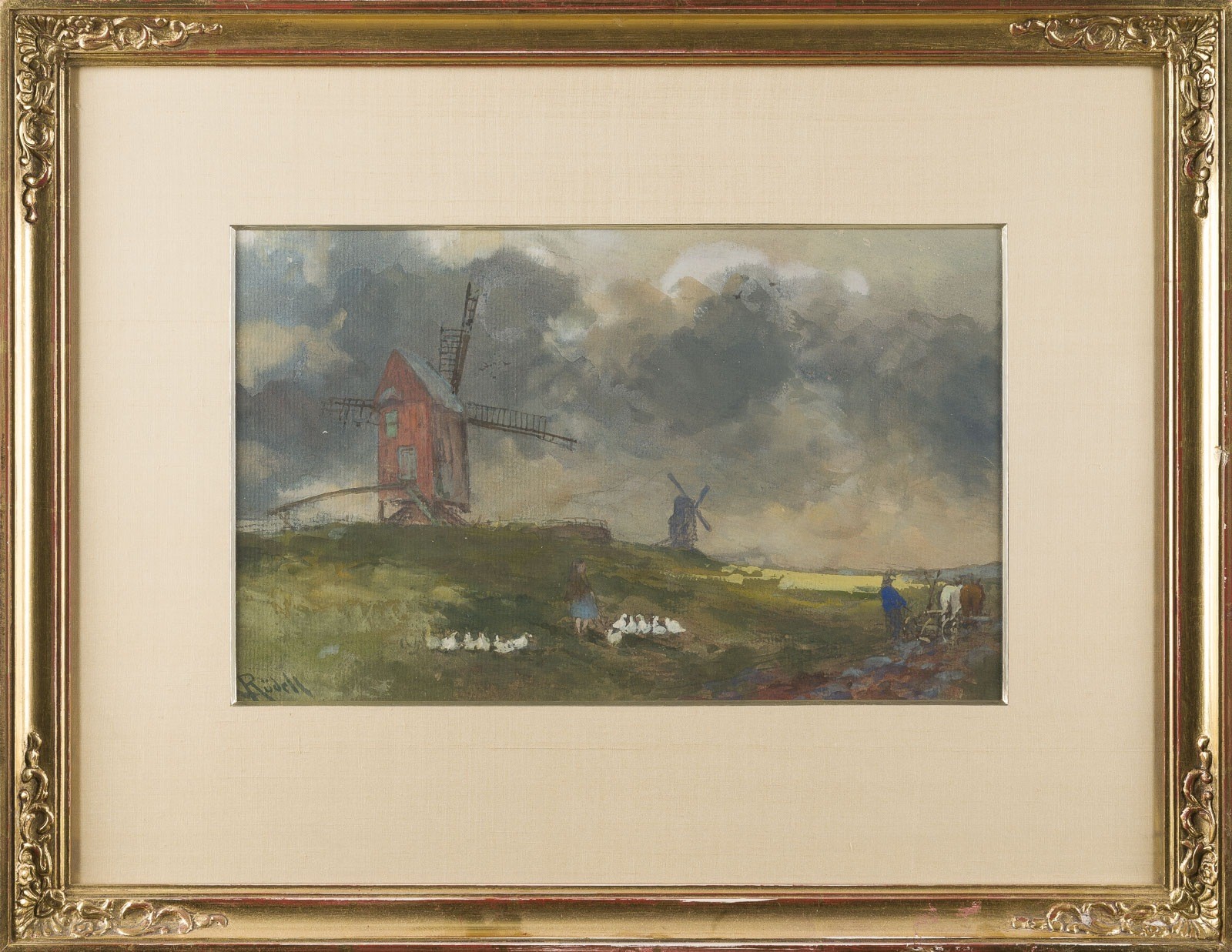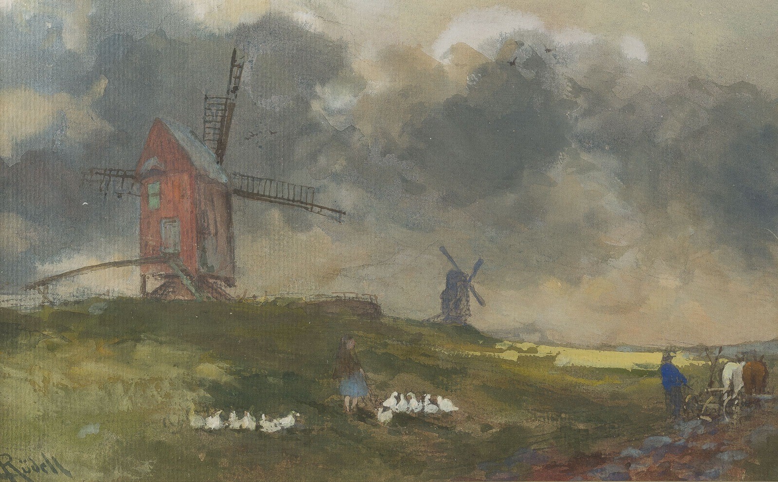ZWEI LANDSCHAFTEN: GEWITTERHIMMEL ÜBER ACKERLAND MIT WINDMÜHLEN. KLARER TAG AM DORFRAND