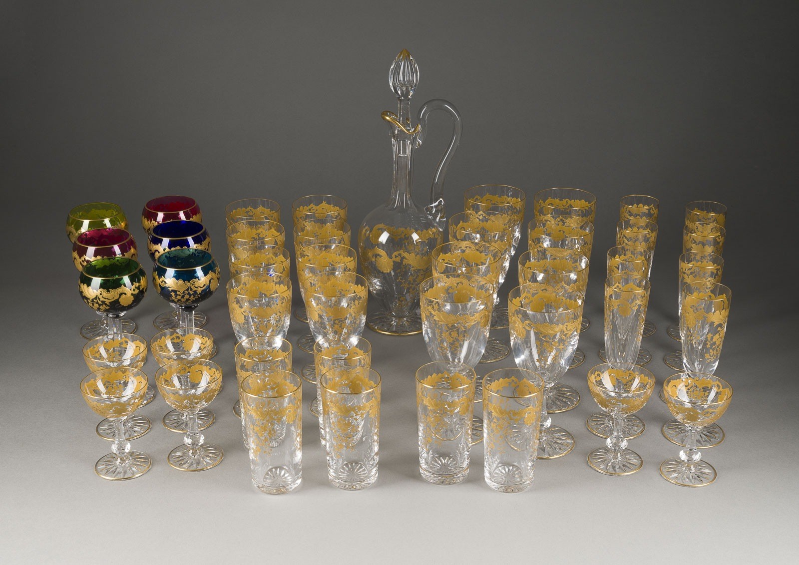 Farbloses Kristallglas mit Goldstaffage, teils farbig überfangene Kuppa. H. 10,3 cm (Cocktailgläser), H. 16-17,5 cm (Weingl. Teilw. mit Ätzstempel im Boden. Bestehend aus: 6 Cocktailgläsern, 8 Weingläsern, 8 Wasserkelchen, 6 Weingläsern (zweite