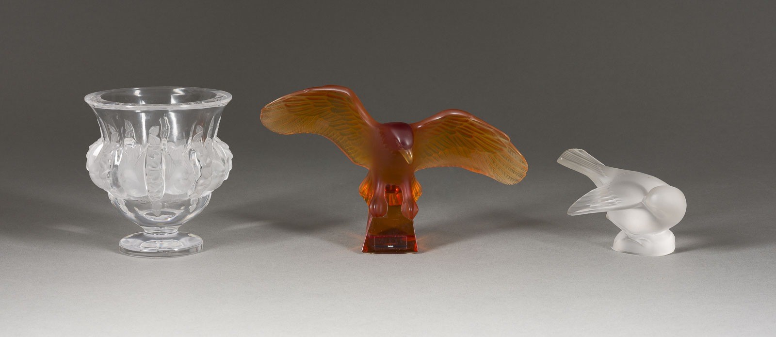 Farbloses bzw. bernsteinfarbenes Glas, teilweise satiniert. H. 7,5-12,2 cm. Jeweils bez. 'Lalique France', 'Lalique R (im Kreis) France', einmal Manufakturaufkleber und Originalbox. Bestehend aus: 1 Vase 'Dampierre', 1 'Moineau Coquet' und 1 'Adler'.