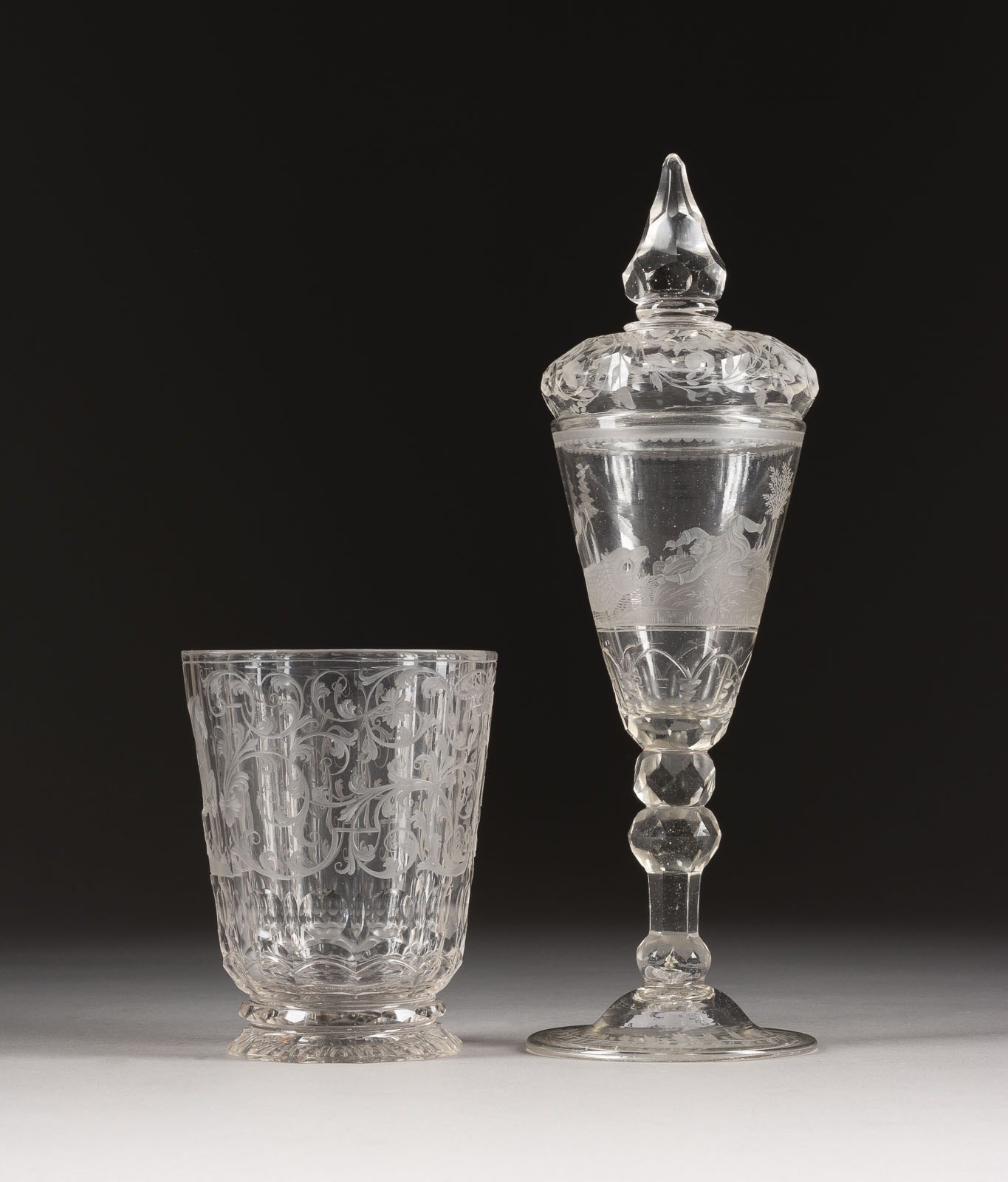 Farbloses Glas, geschliffen, geschnitten. H. 12-27 cm. 1 Deckelpokal mit Abriss und umgeschlagenem Rand, leicht ansteigendem Scheibenfuß,