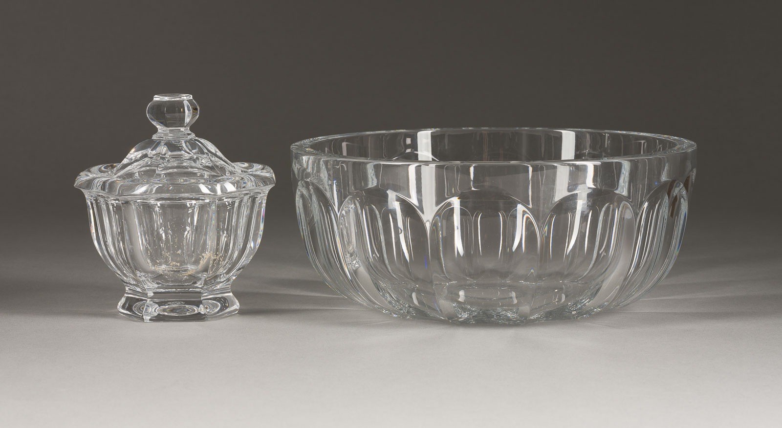 Farbloses Kristallglas, geschliffen. D. 25 cm (Schale), H. 13,7 cm (Zuckerdose). Jeweils im Boden mit Ätzstempel, Schale mit Schriftzug 'Baccarat'.
