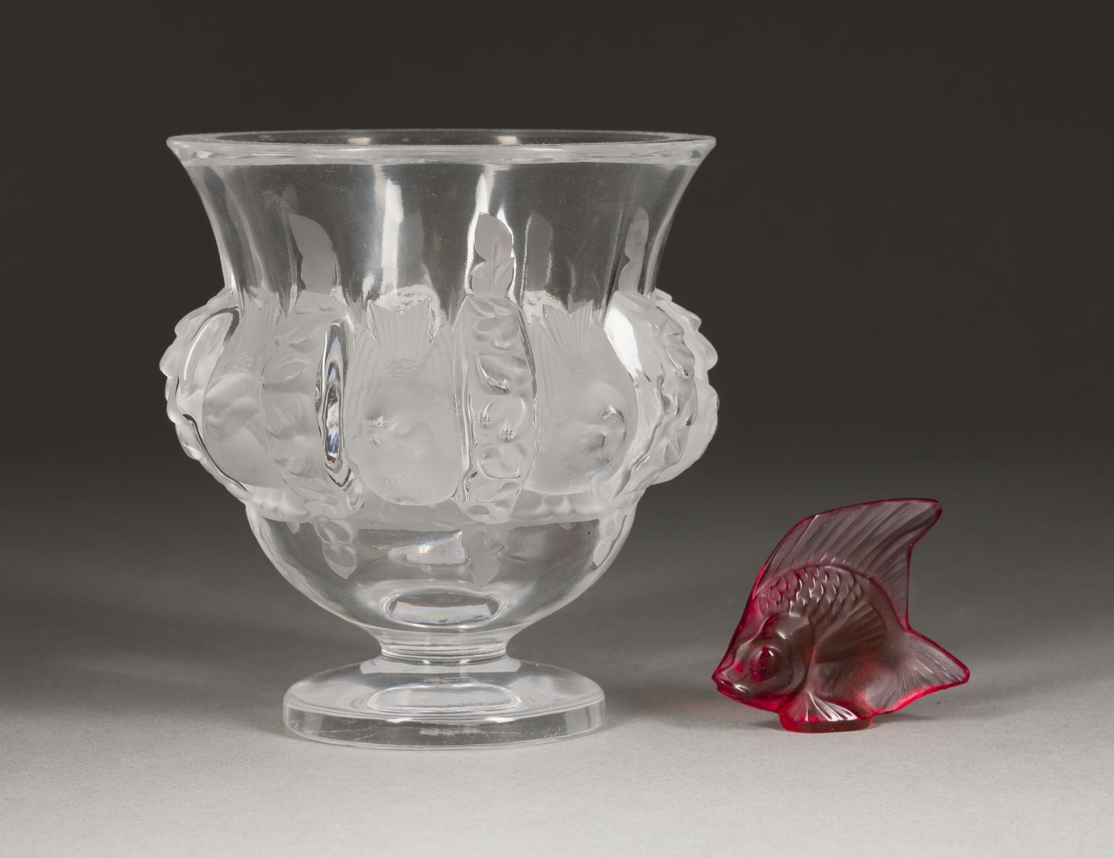 Farbloses Pressglas, teilw. mattiert, rotes Kristallglas, satiniert. H. 12 cm (Vase), H. 4,5 cm (Fisch). Unterhalb nadelgeätzt bez. 'Lalique/France'.