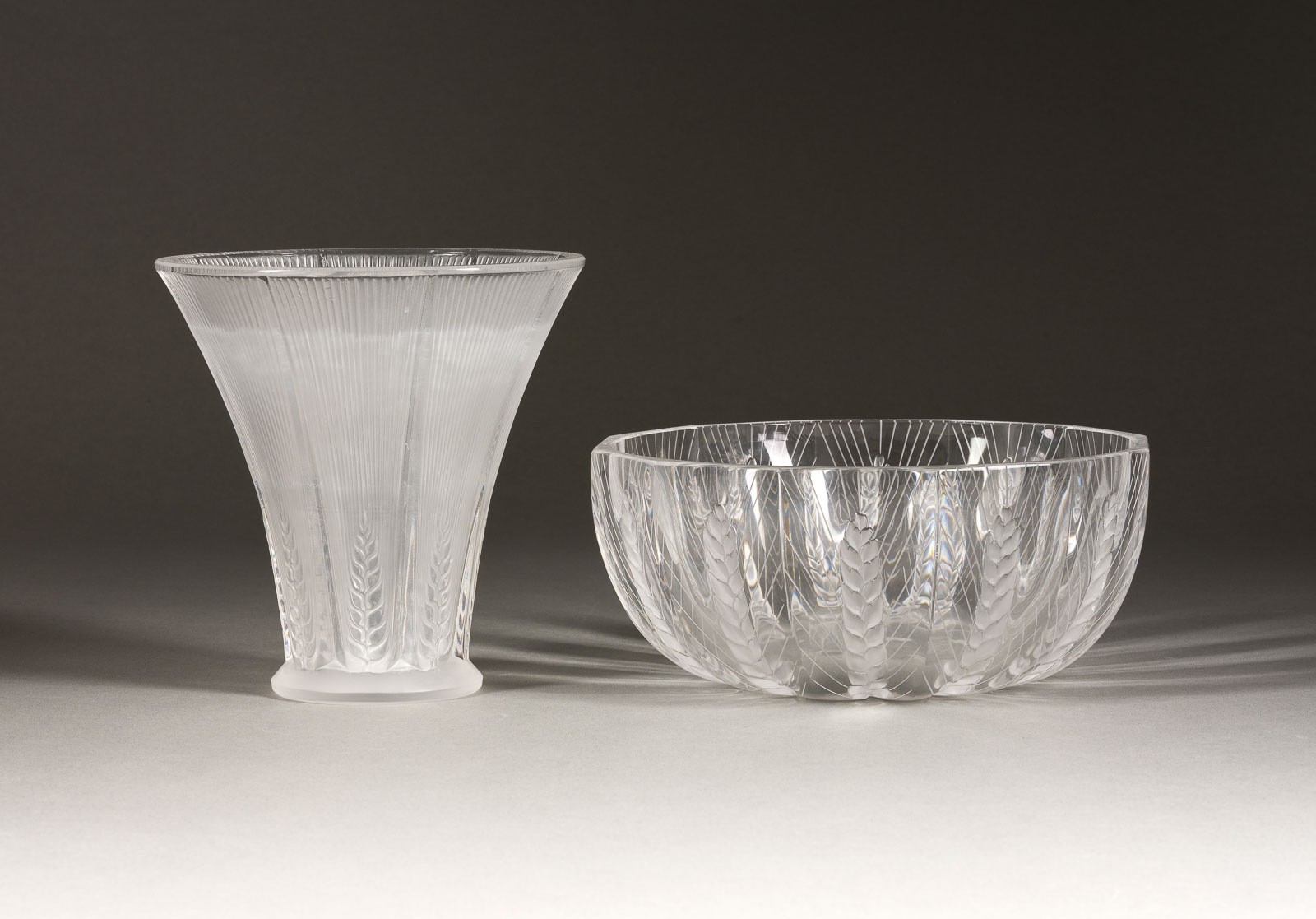 Farbloses Kristallglas, gepresst, teilweise satiniert. H. 16,5 cm (Vase), D. 21,5 cm (Schale). Jeweils bez. 'Lalique France' (einmal mit R im Kreis).
