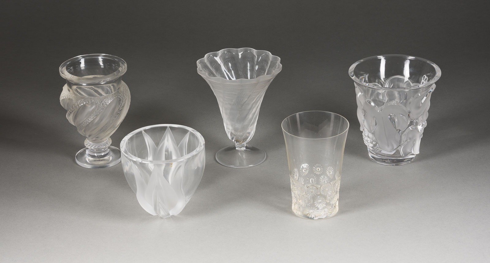 Farbloses Pressglas, part. satiniert. H. 9,6-15 cm. Jeweils bez. 'Lalique France' (dreimal mit R im Kreis). Bestehend aus: 1 Glas 'Daisy', 1 Vase 'Ermenonville', 1 Vase 'Deux Tulipes', 1 Vase