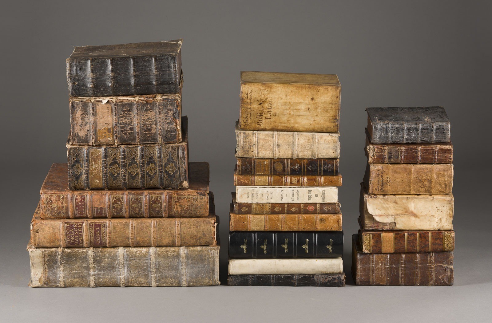 12 Bände, teilweise in Leder gebunden. Unterschiedliche Größen. Part. besch., fleckig, gebräunt, nicht auf Vollständigkeit geprüft. 1) Abraham a Sancta Clara, Wohl angefüllter Wein-Keller (...), Würzburg, Franz Martin Hertz, o.J., Ledergebunden, 21,5 x 17 x 10 cm, besch., gebräunt, fleckig.