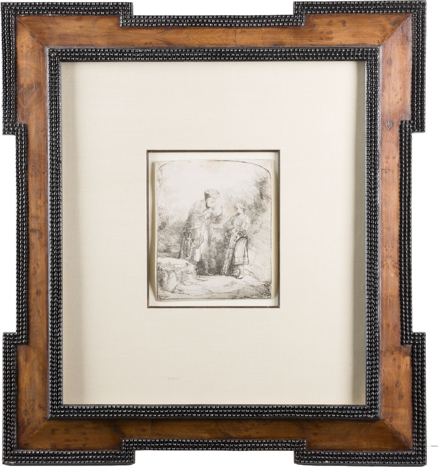 Radierung auf dünnem, glattem Papier ohne erkennbare Büttenstruktur oder erkennbares Wasserzeichen. BM 15,7 x 13,1 cm (R. 52 x 47,5 x 3,5 cm). Unten links in der Platte bez. 'Rembrandt 1645'. Fleckig, bis auf den Plattenrand beschnitten, part. besch. und rest., Ränder ergänzt; verso mit Tinte und Bleistift diverse handschriftl. Anmerkungen (sekundär). In einem Passepartout und hinter Glas gerahmt.
