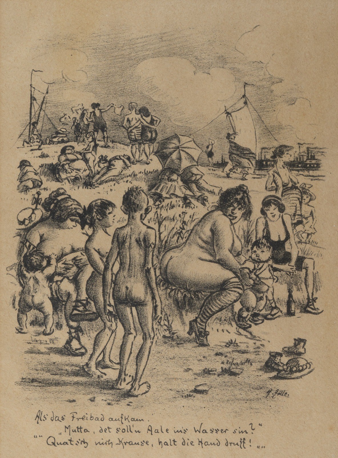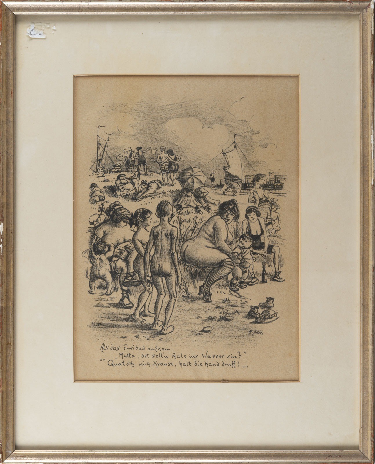 Lithografie auf Papier. SM 33,5 x 24,5 cm (R. 51 x 41 x 2 cm). Unten rechts im Stein signiert 'H. Zille'. Unten Mitte im Druck Text 'Als das Freibad aufkam. - 'Mutta, det soll'n Aale ins Wasser sin?' 'Quatsch nich Krause, halt die Hand druff!'". Gebräunt, lichtrandig, min. fleckig. Blatt 36 des Zyklus "Zwanglosse Geschichten und Bilder". In einem Passepartout und hinter Glas gerahmt.