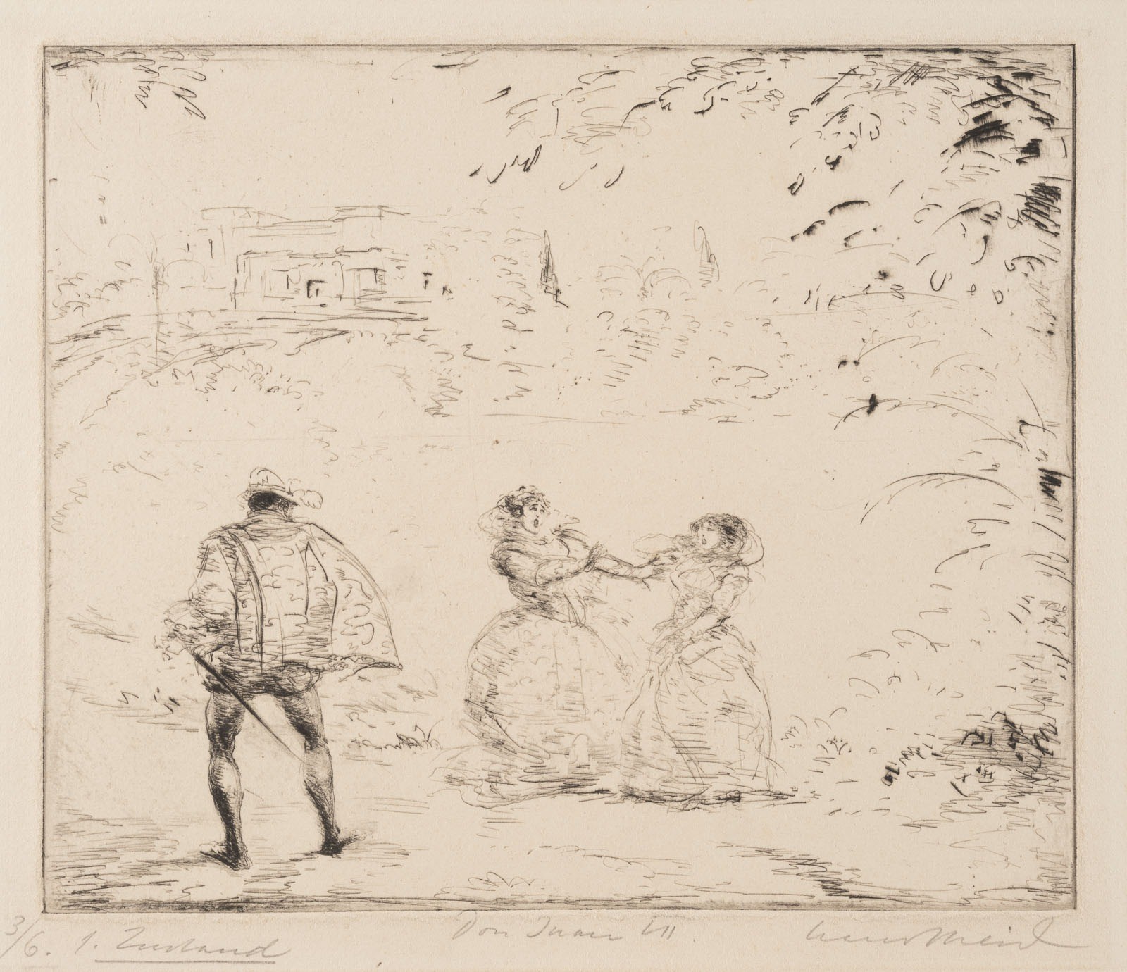 Radierung auf Papier. BM 28,5 x 35,5 cm, DM 20 x 24 cm. Unten rechts handsigniert 'Hans Meid', unten Mitte betitelt 'Don Juan VII' und unten links mit Exemplarnummer '3/6 1. Zustand'. Gebräunt, verso Montierungsreste.