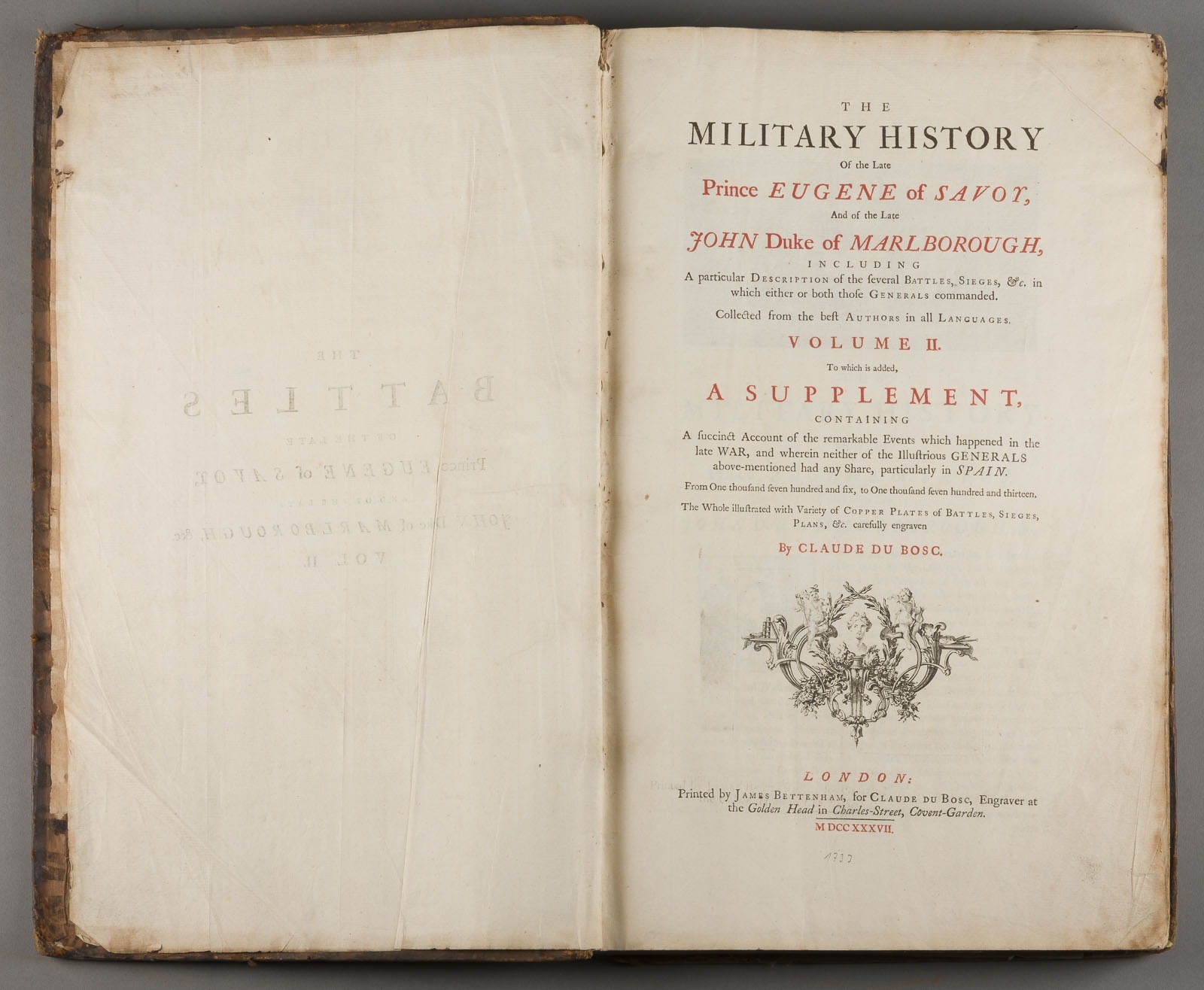 4) Claude du Bosc, The Military History of the late Prince Eugene of Savoy and the late Duke of Marlborough (.), Band 2, London, James Bettenham, 1737 (42 x 26,5 x 4 cm).