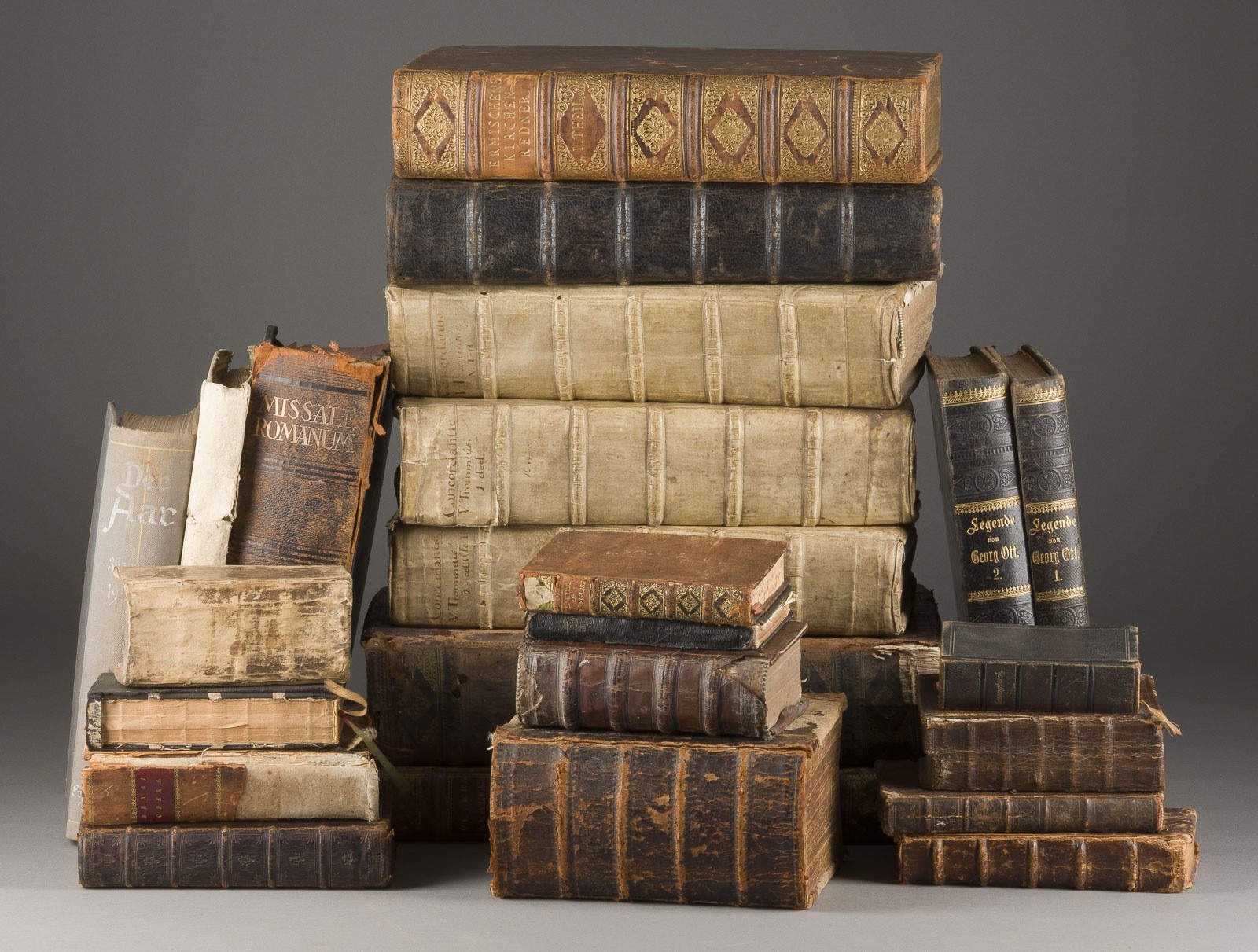 24 Bde. in unterschiedlichen Ausführungen. Unterschiedliche Größen. Part. besch., part. gebräunt, part. fleckig, part. mit Wurmfraß, nicht auf Vollständigkeit überprüft. 1) F. Francisco, Postillae sive Enarrationes Epistolarum (...), 4. Teil, Köln 1570 (16,5 x 10 x 6 cm).