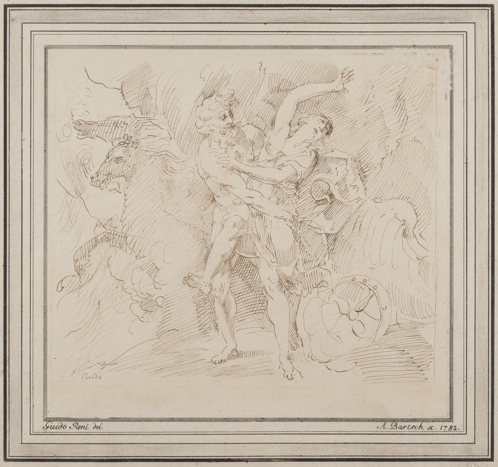 Radierung in Braun auf Papier. DM 29 x 31,5 cm (R. 50 x 52 cm). Unten links bez. 'Guido Reni del.', unten rechts 'A. Bartsch sc. 1782'. Leicht fleckig, part. besch. Radierung nach einer Zeichnung von Guido Reni, wohl aus 'Le Peintre Graveur', Tafel 16. Im Passepartout und hinter Glas gerahmt (ungeöffnet).