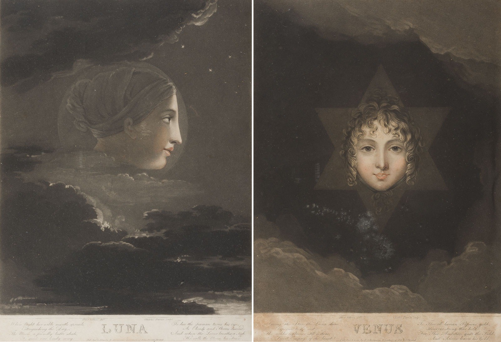 2 Mezzotintoradierungen, koloriert, auf Papier, auf Papier montiert. 28,5 x 20,5 cm (R. 39 x 32 x 2 cm). Jew. in der Platte bez. 'Charles Turner sculpt.', 'Huet Villiers delt.' sowie betitelt. Gebräunt, fleckig, beschnitten. Jew. hinter Glas gerahmt (ungeöffnet).