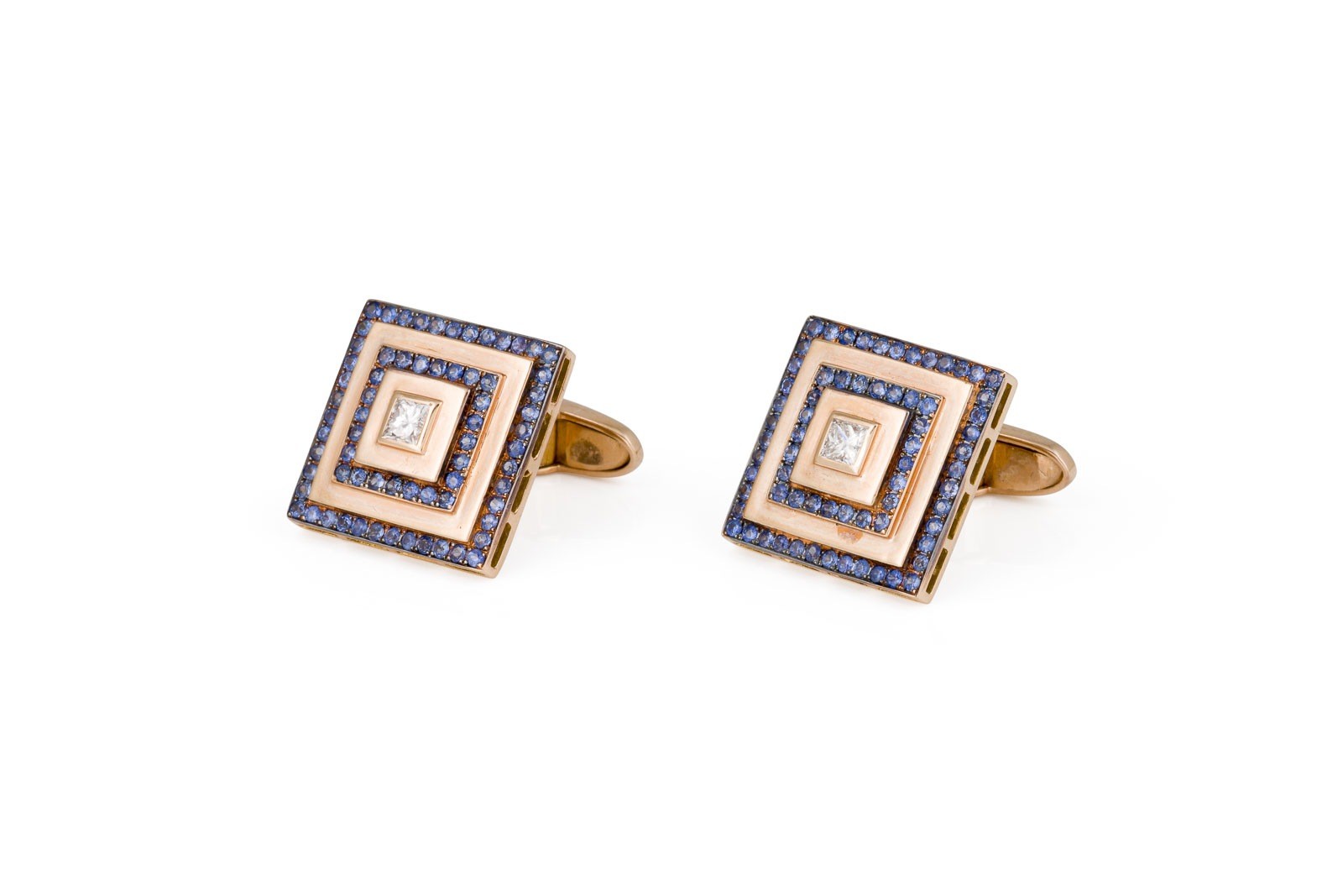 RG 750 (getestet). Maße: ca. 16,1 x 16,1 mm. Ges.-Gew.: ca. 11,3 g. Quadratische Manschettenknöpfe von 'Carlota', jeweils besetzt mit einem zentralen