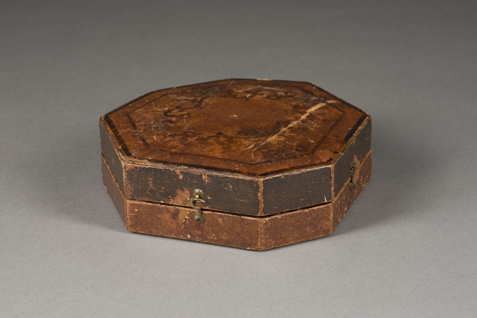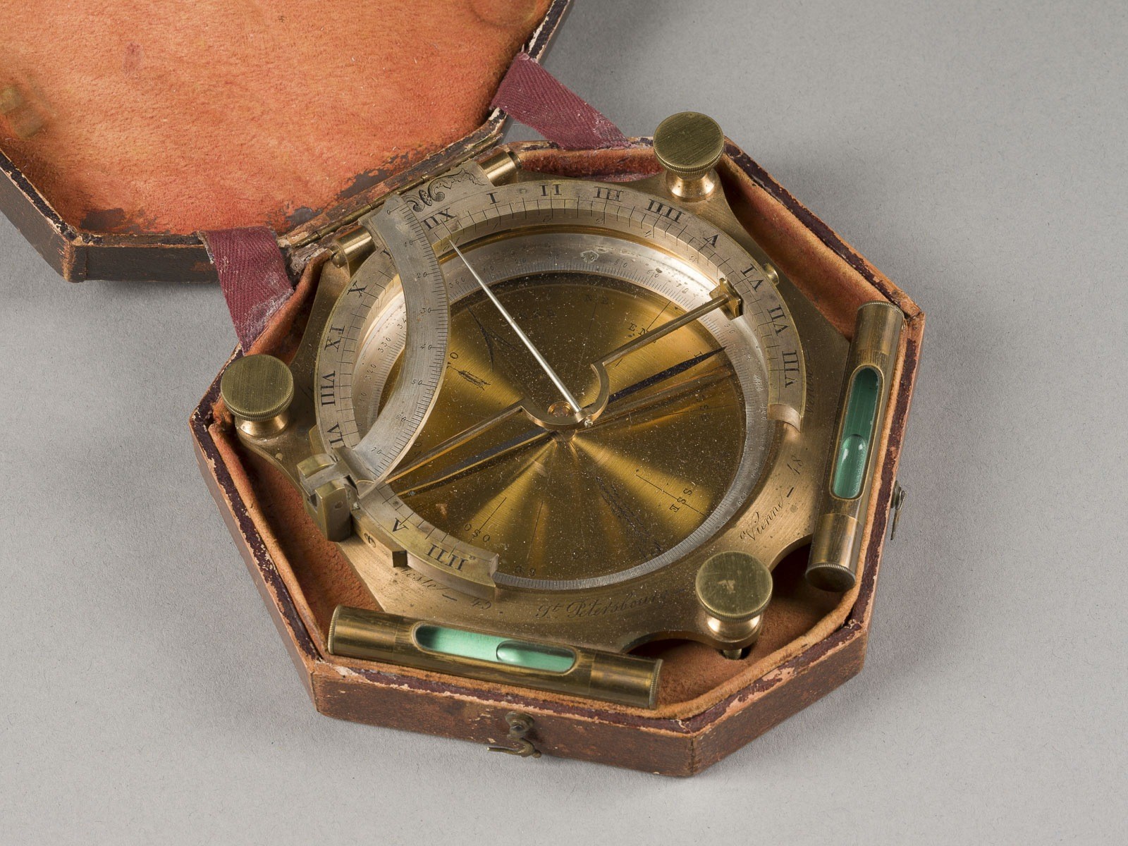 Messing, Glas, Stahl, in mit geprägtem Leder bezogener Holzschatulle. 5 x 14,5 x 15,5 cm. Mit zwei Wasserwagen versehener, höhenverstellbarer Kompass. Gravierte Inschriften mit