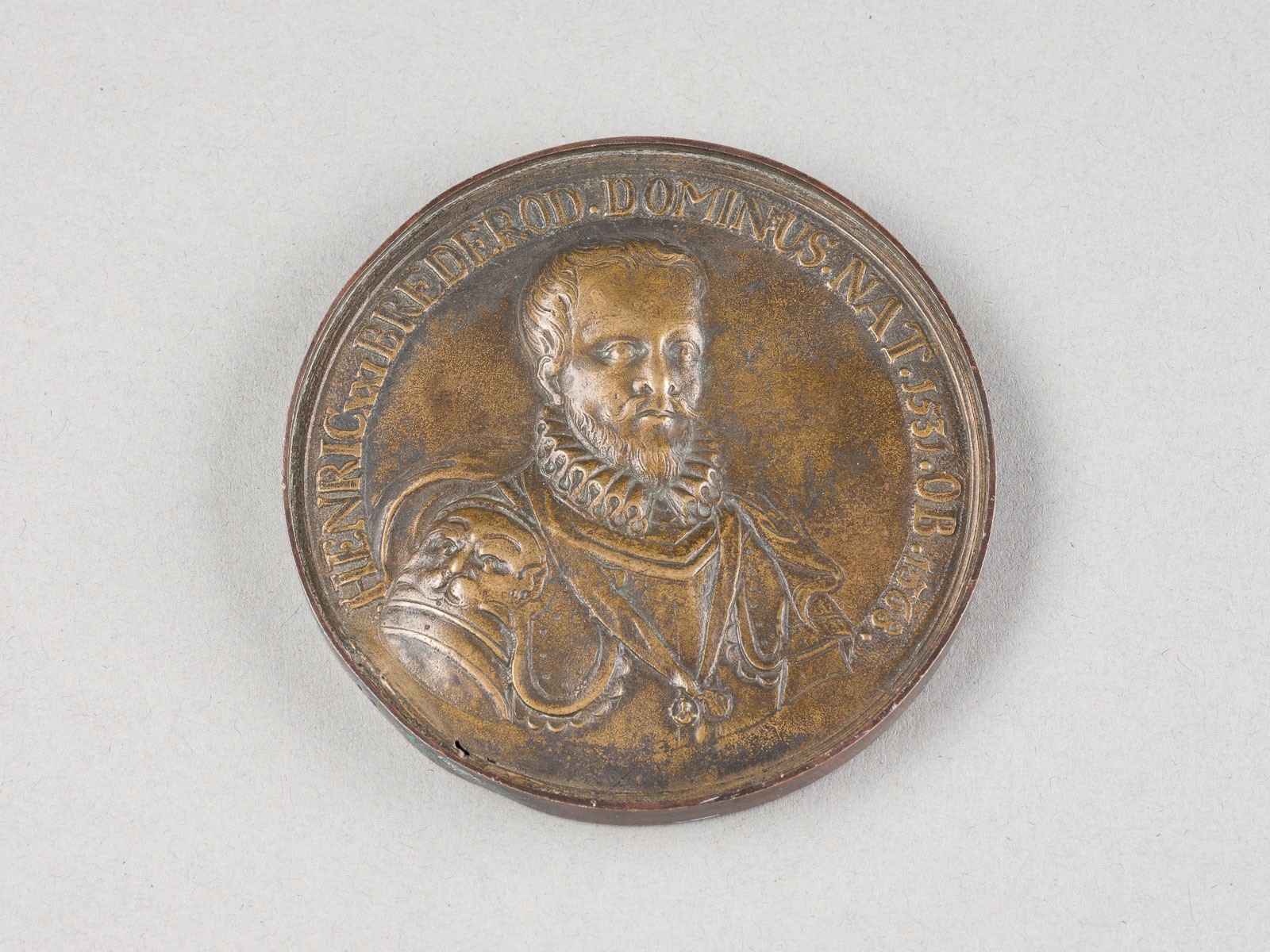 Bronze. 8 x 0,5 cm. Runde Plakette mit reliefiertem Brustbildnis Hendrik van Brederodes, umgeben von