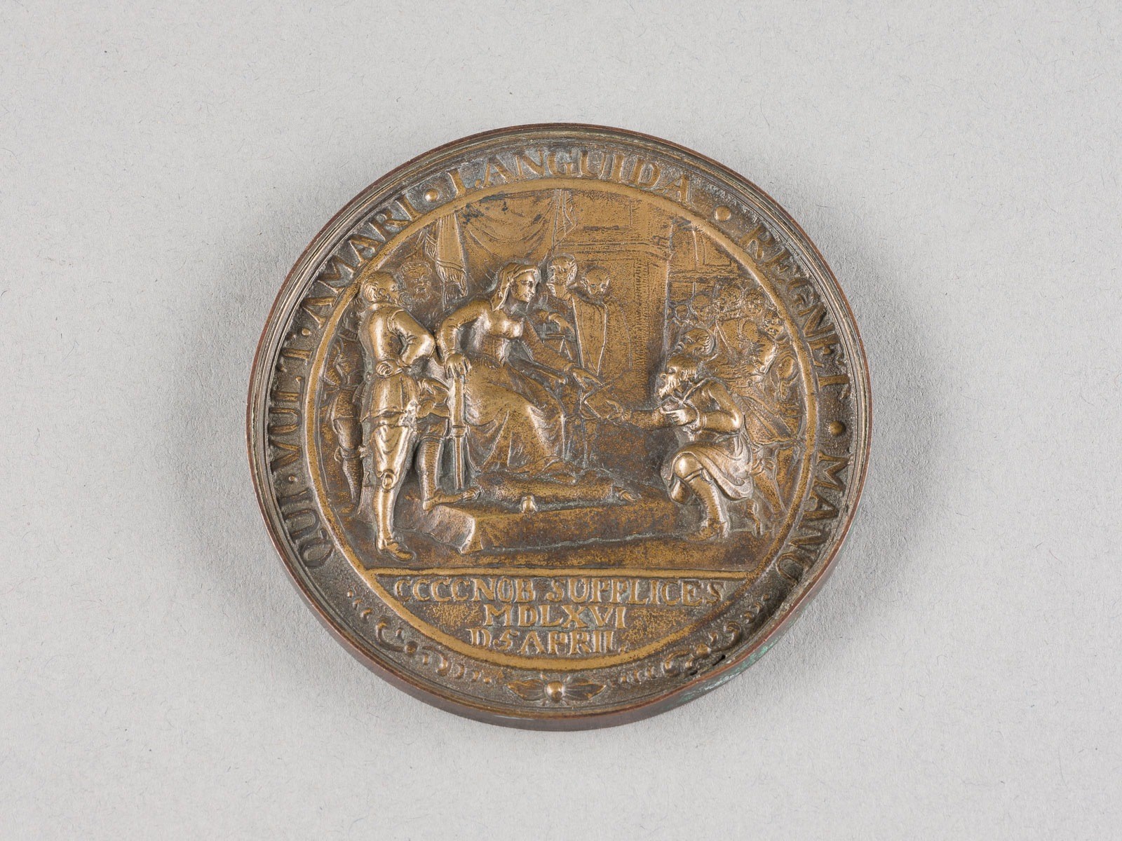Darstellung der Übergabe einer Petition durch Hendrik an Margarete von Parma und Inschrift