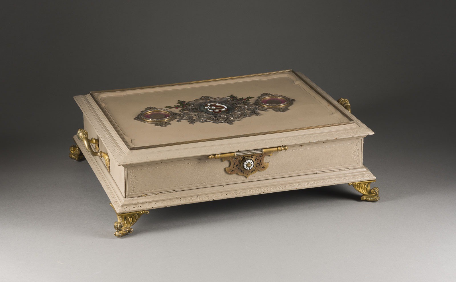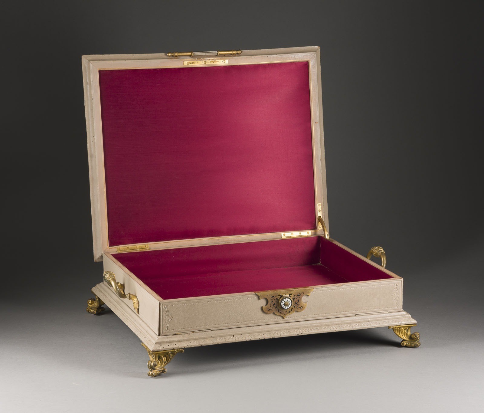 Bronze, part. vergoldet, Metall, Email, Samt, Textil. 16 x 53 x 43 cm. Innen bez. 'Czettel es Deutsch Budapest'. Auf vier blattverzierten Bronzefüßen Rechteckkorpus mit abschließbarem Scharnierdeckel und