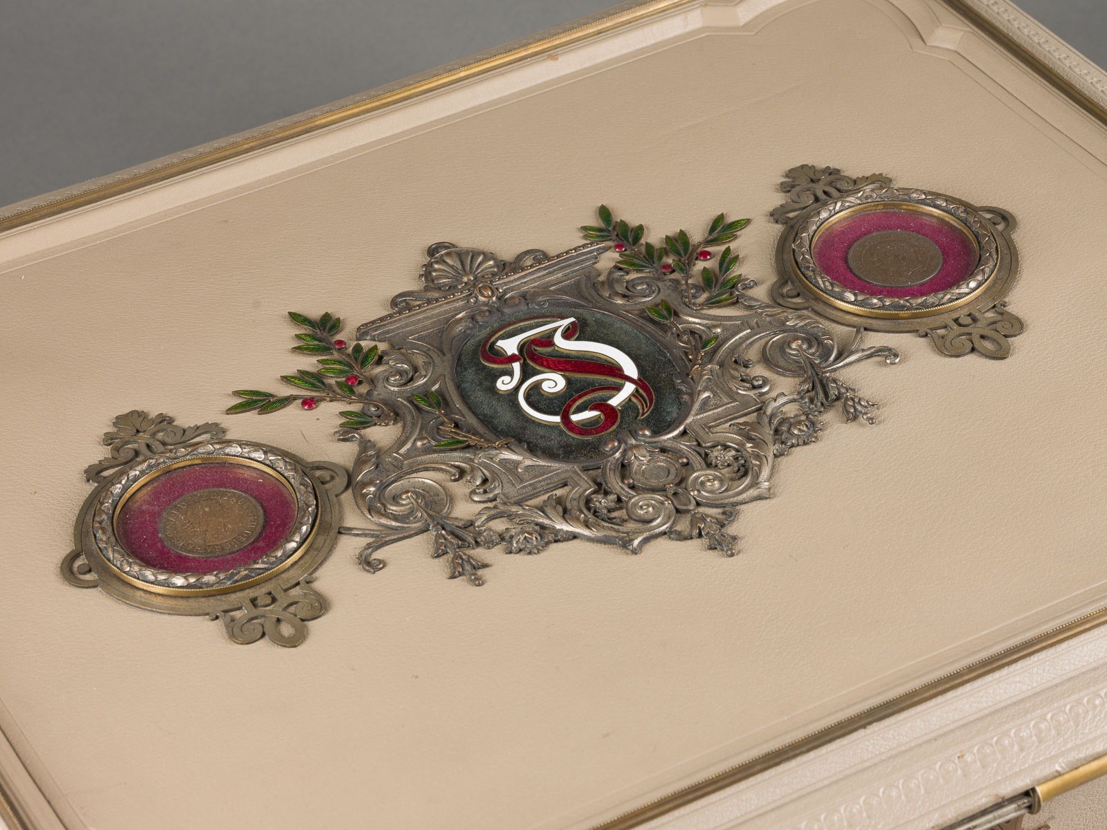 seitlichen Handhaben. Auf dem Deckel ornamentierte Kartuschen mit emailliertem Monogramm,