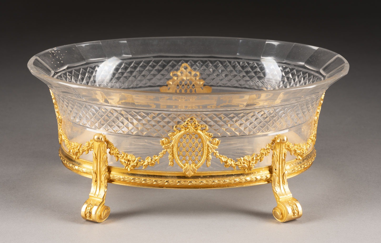 Klarglas, geschliffen, vergoldete Bronzemontierung. H. 11 cm, L. 25 cm. Ovale Form auf vier Volutenfüßen. Vergoldete Montierung mit Floraldekor. Geschliffener