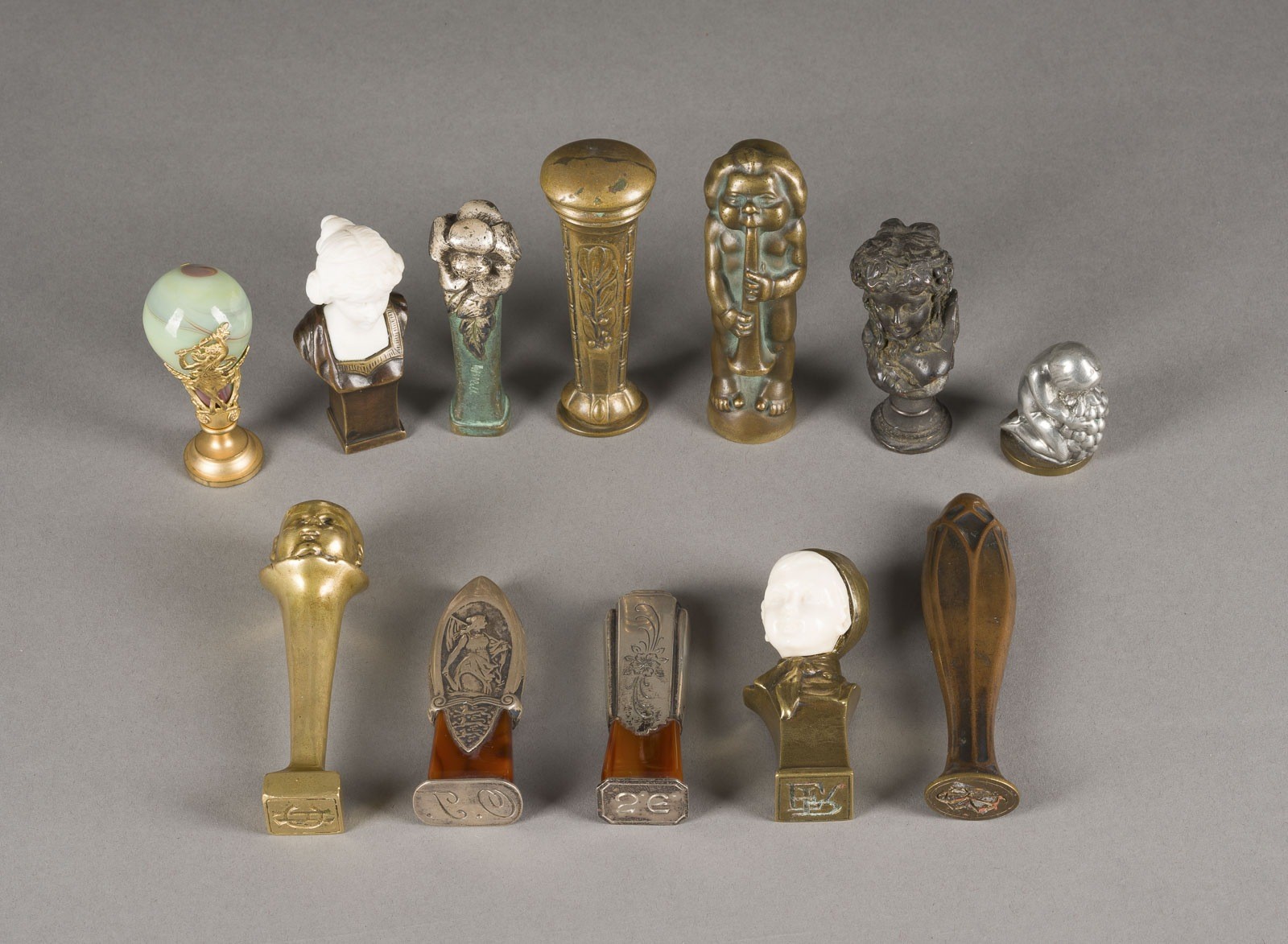 Verschiedene Materialien, wie Bronze, Messing, Kupfer, part. versilbert, Glas, Kunststoff. Max. L. 11 cm, min. L. 4,5 cm. U.a. bez. 'F. Lügerth'. Unterschiedliche Ausführungen und Monogramme. Part. besch.
