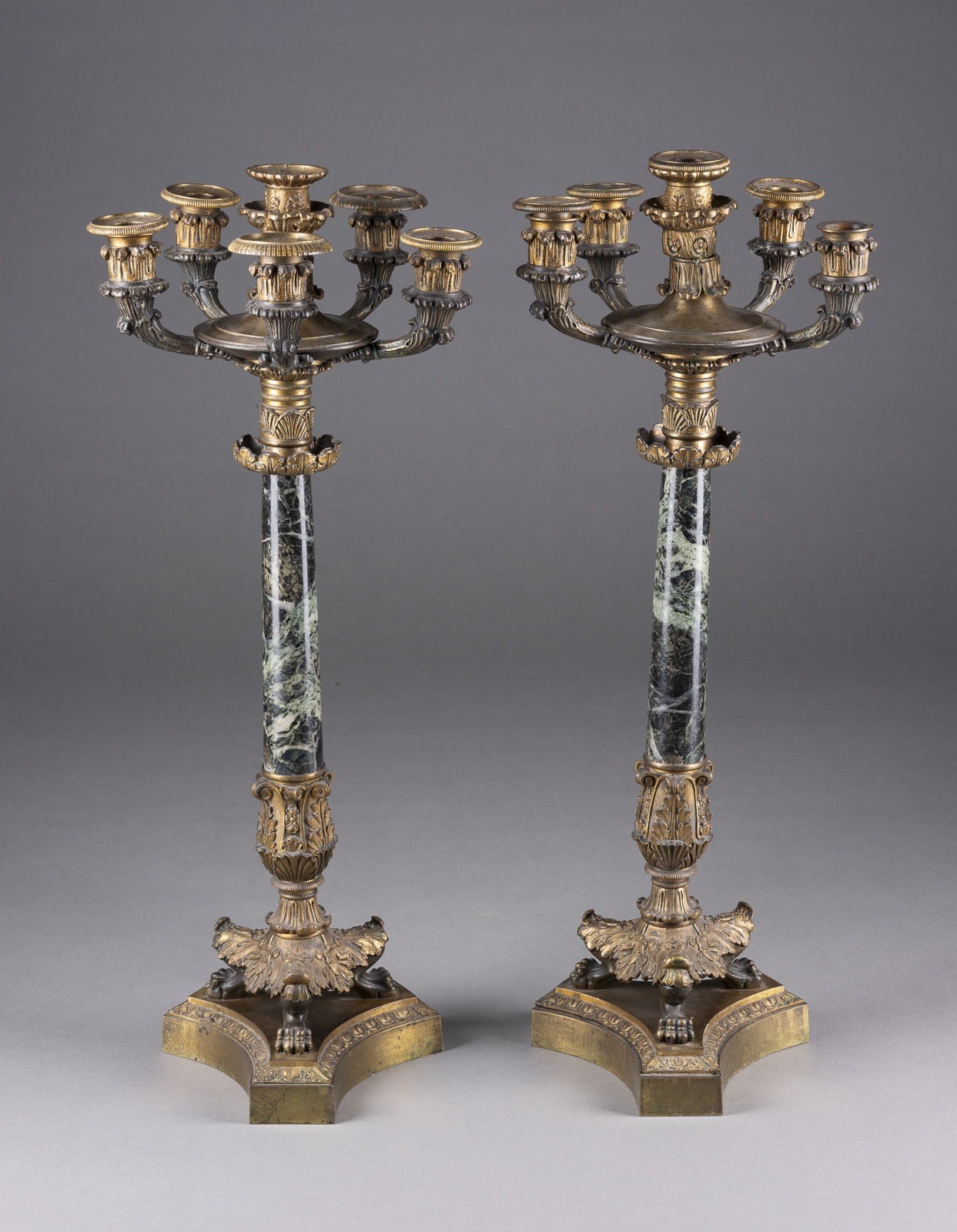 Bronze, Marmor. 59 x 23,5 x 22,5 cm. Dreipaßplinthe über floral verzierten Tatzenfüßen. Marmorschaft. Je sechsflammig. Besch.: 1 Leuchterarm fehlt, 1 Traufschale fehlt und 2 Traufschalen ersetzt.