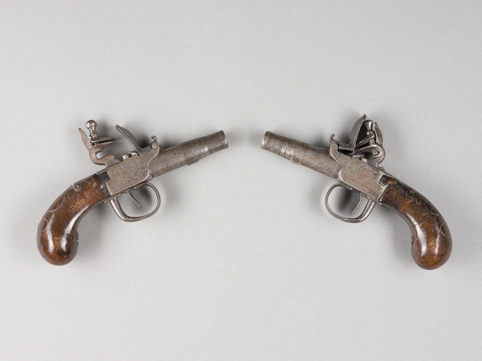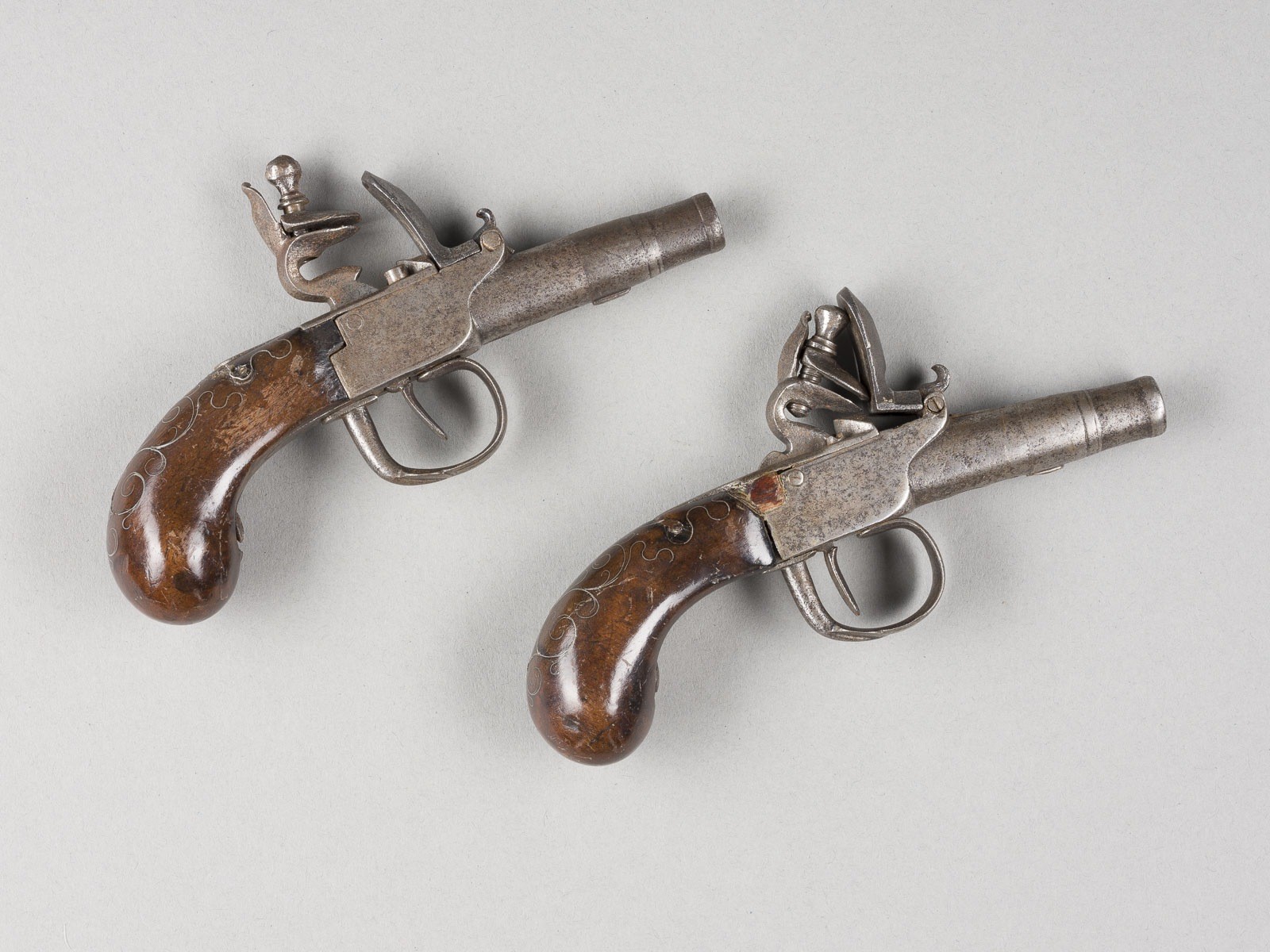 Holz, Eisen. L. 15,5 cm. Auf der Unterseite des Laufs unterschiedliche Beschusszeichen: 'V', 'R', 'G', jeweils im Oval. Polierter Holzgriff mit feinen, ornamentalen Silbereinlagen, Steinschloss. Gebrauchsspuren, part. besch., Funktion ungeprüft.