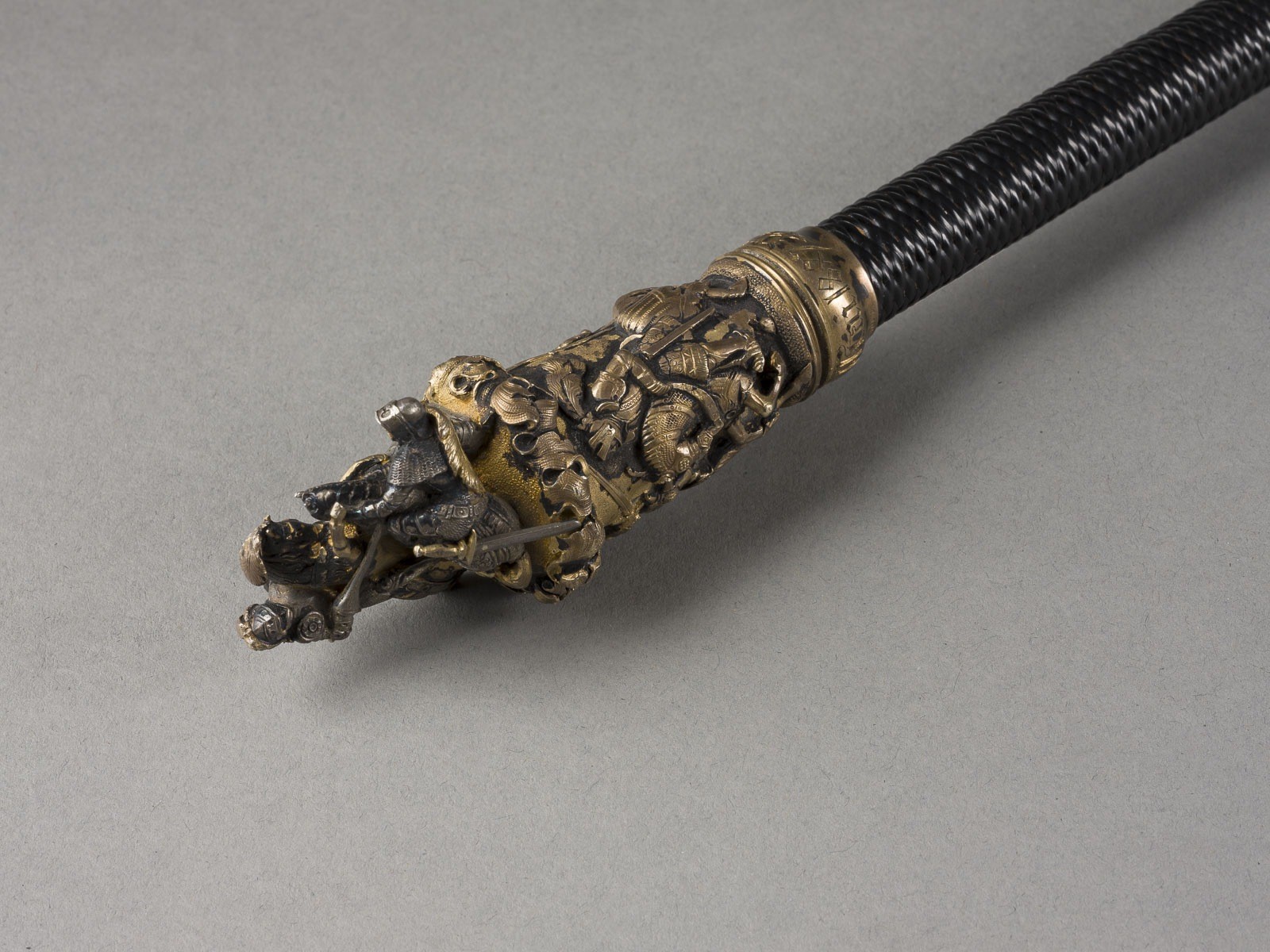 Vergoldet, versilbert, geflochtener Schaft. Gesamt-L. 97 cm, Griff-L. 10 cm. Auf der Zwinge bez. 'Swaine & Isaac Makers London'. Griff mit reliefierten und vollplastischen Darstellungen von Ritterkämpfen. Auf der Zwinge