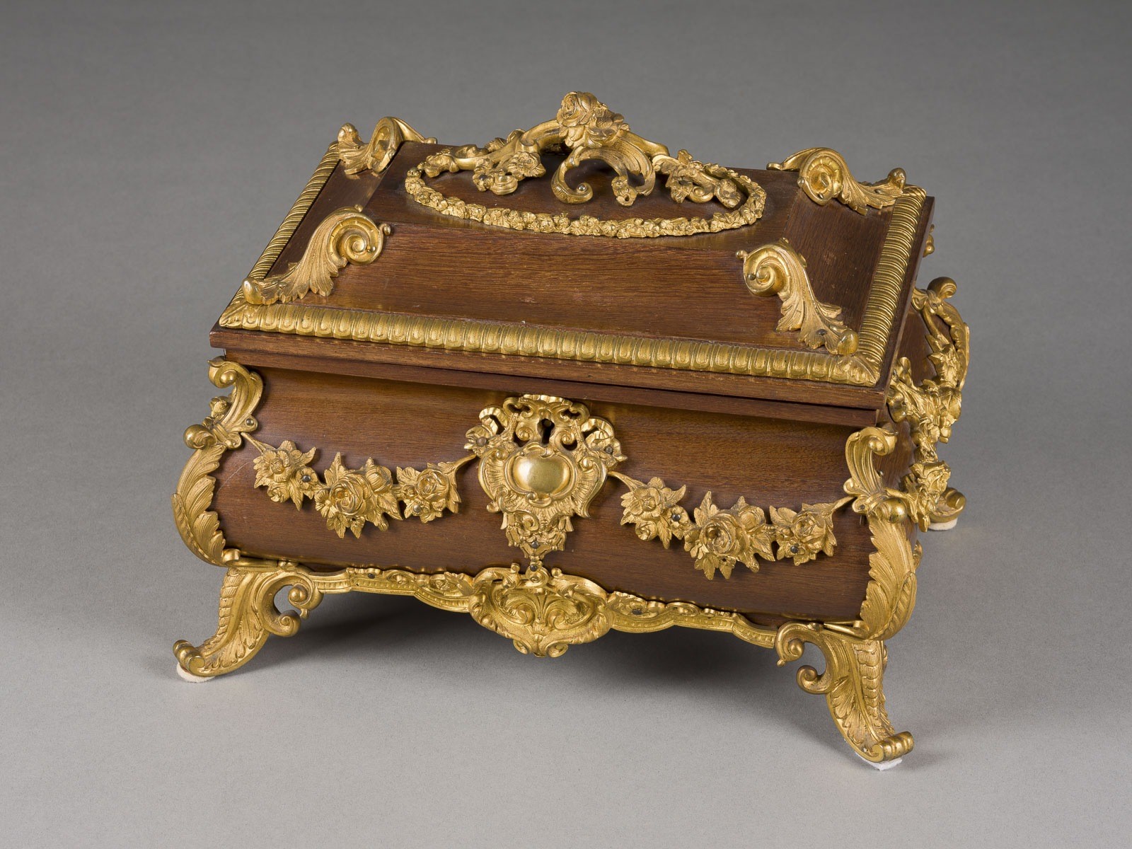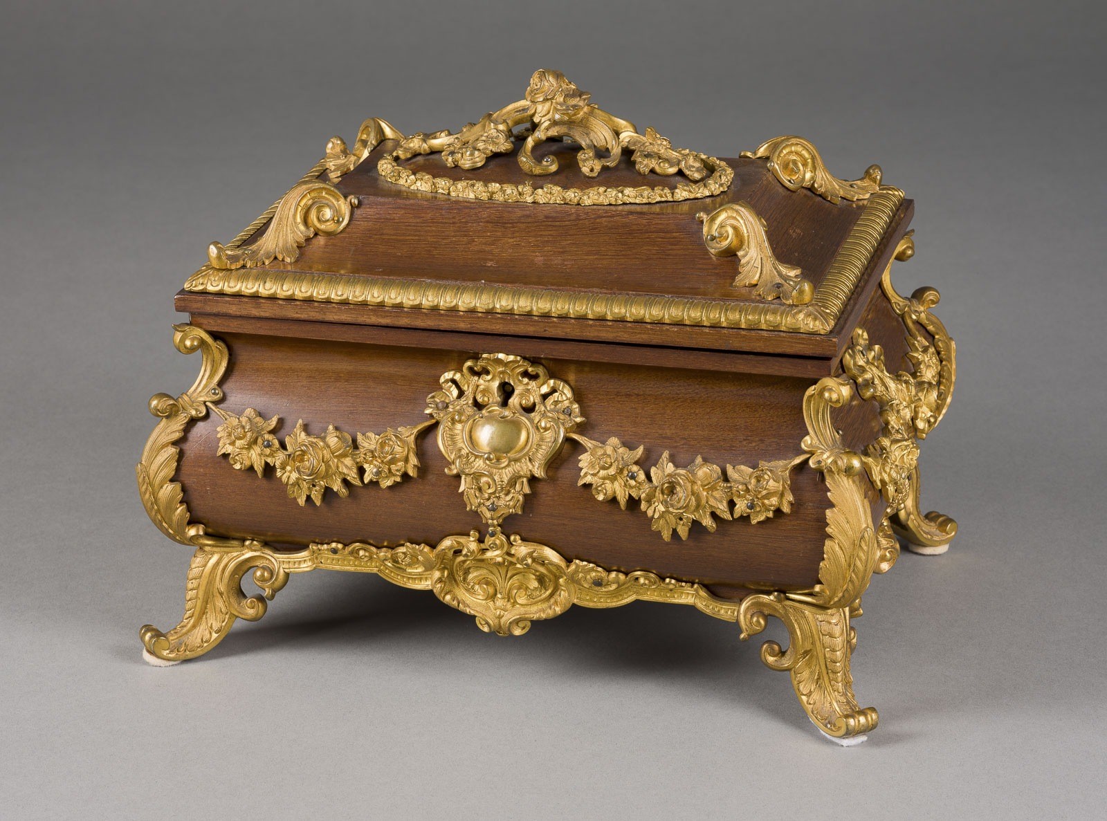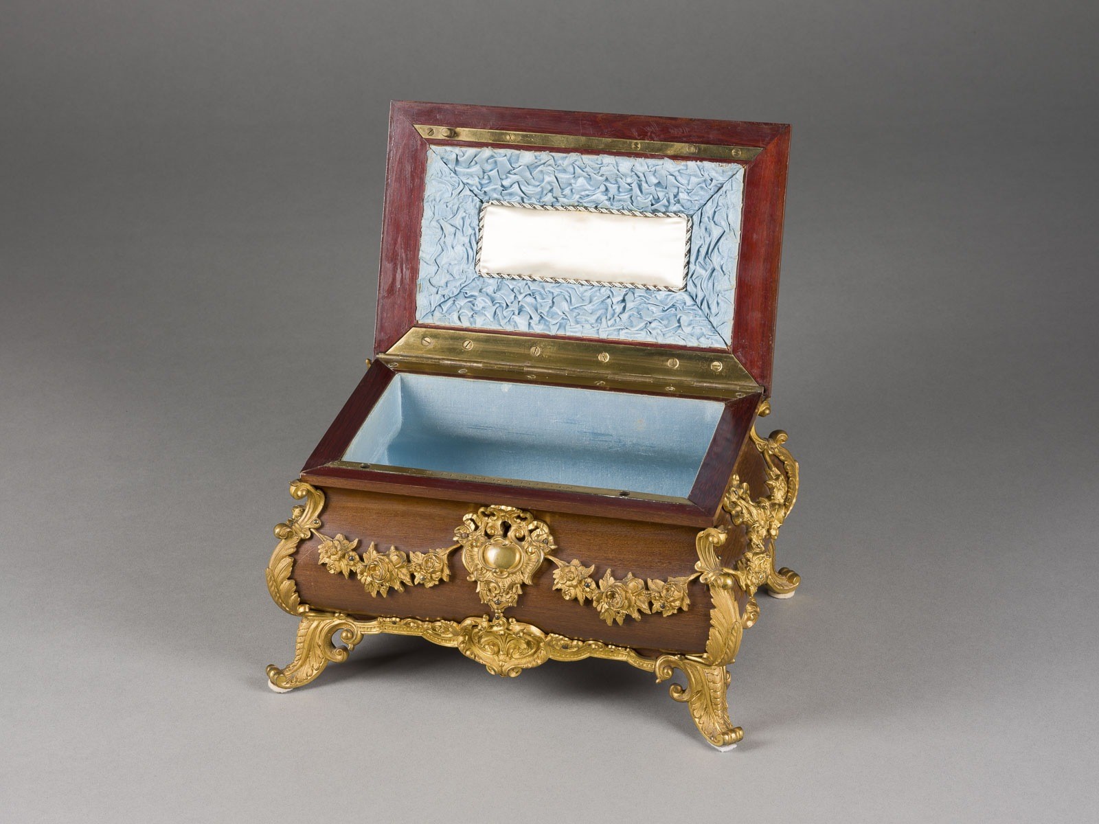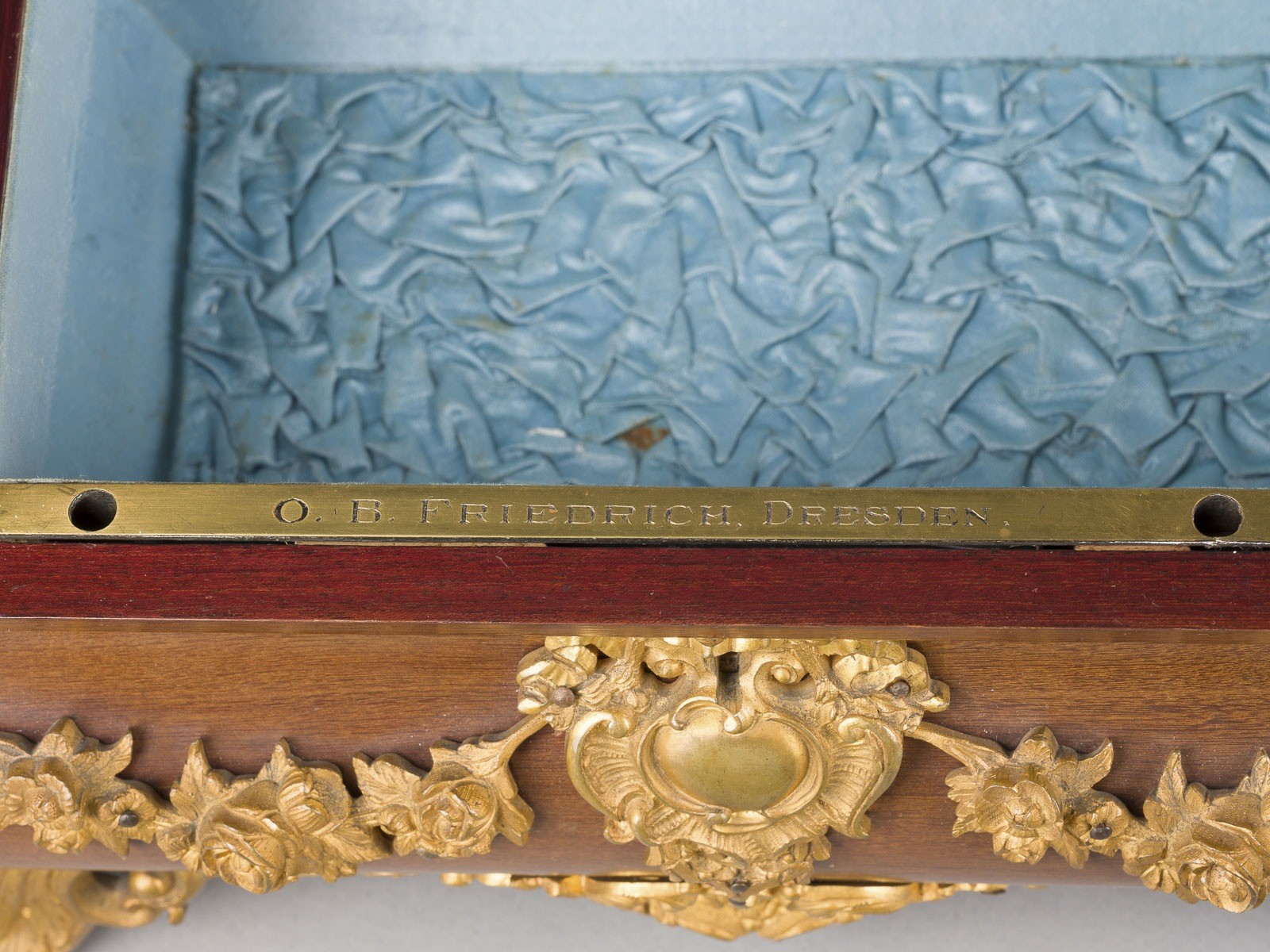 Satinholz, furniert, Bronze, feuervergoldet, Stoff; mit Schlüssel. 24 x 30 x 21 cm. Innen auf dem Stulp bez. 'O. B. Friedrich Dresden'. Auf vier blattförmigen Füßen längsrechteckiger, bombierter Korpus mit scharniertem