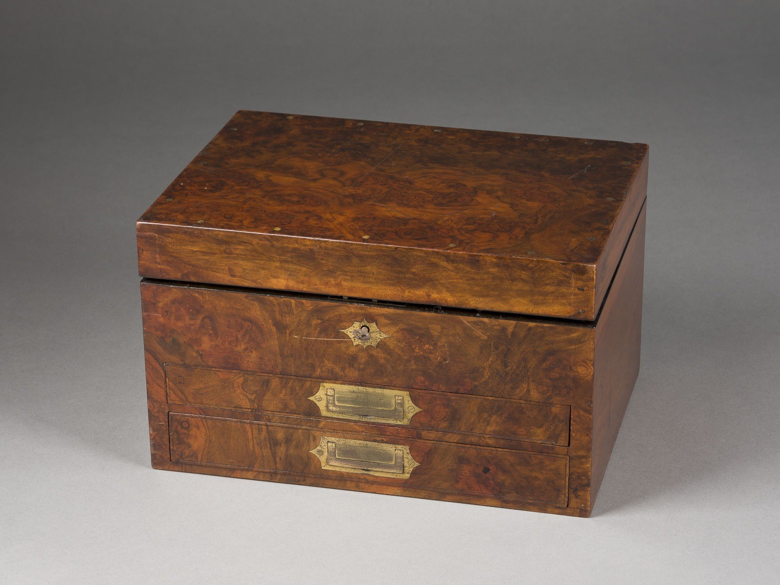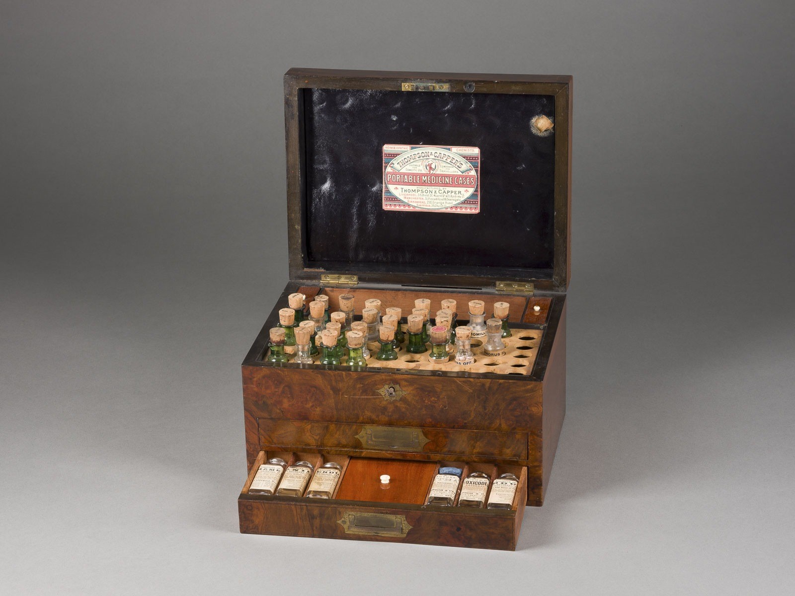 Glas, Korken, Holz, in Orig.-Kasten. 17 x 28,5 x 21,5 cm. Im Deckel Orig.-Etikett 'Thompson & Capper Liverpool, Manchester, Birkenhead, Sheffield'. In Wurzelholz furnierter zweischübiger Korpus mit abschließbarem Deckel.